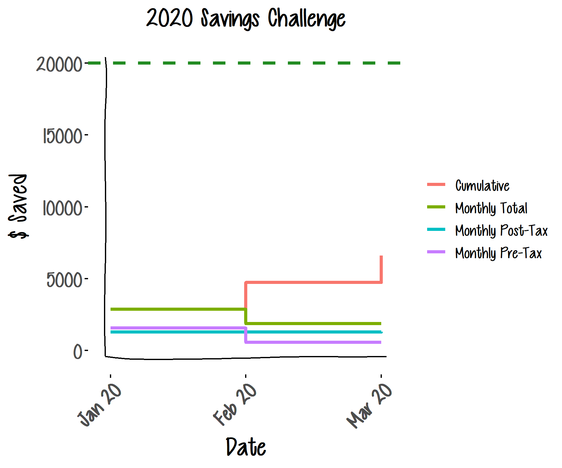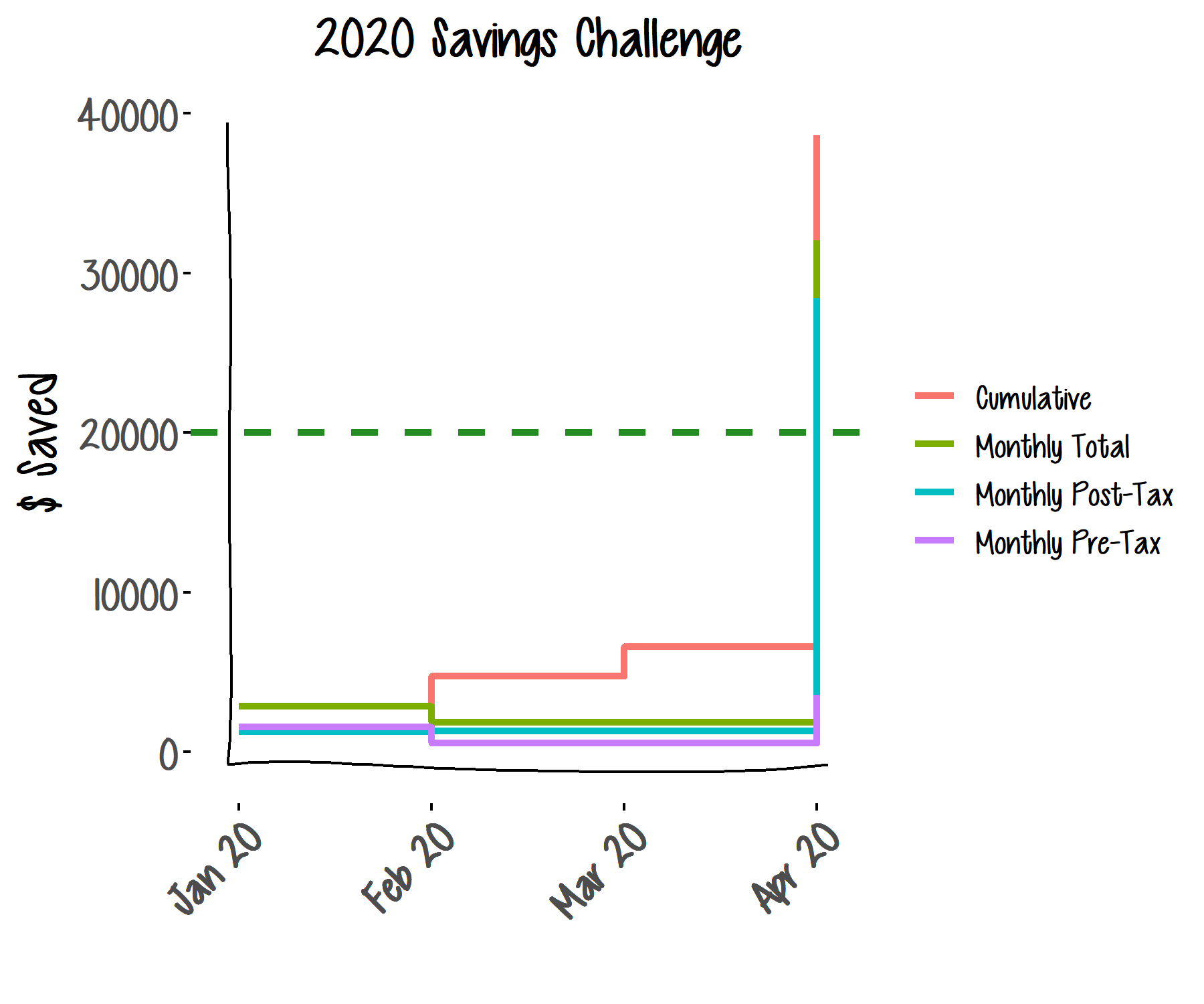 The majority of the savings we have for Q1 come from my 401k contributions ( + employer match), mortgage principal payoff, and HSA contributions. Even though we were playing on “hard” mode (for us) for the first quarter, we were still able to save a total of ~$6600.