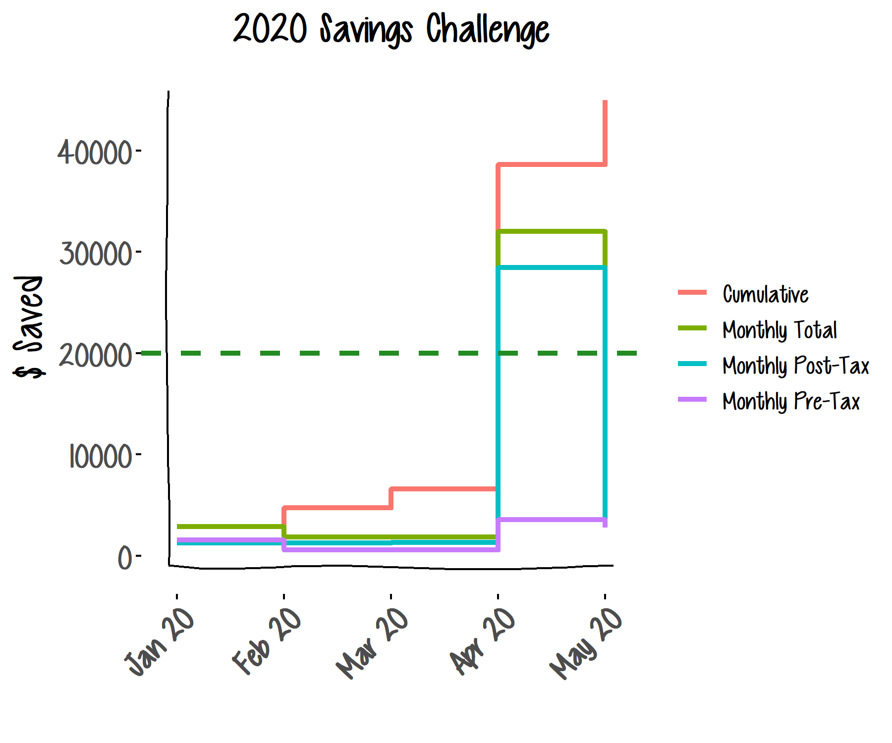 Total to retirement accounts YTD: $8,700. We’re not halfway through the year yet, but I’m halfway through my paychecks (I get a total of ten, monthly pay but no pay June and July). So whether we meet the $20k goal is probably going to depend on whether/how much we save in a savings account to put into a tIRA at the end of the year.