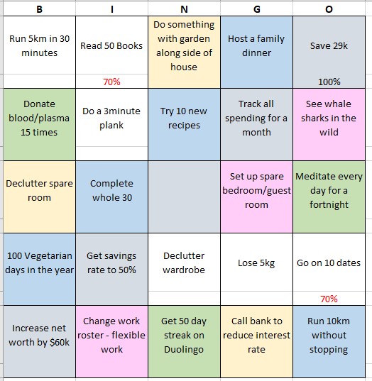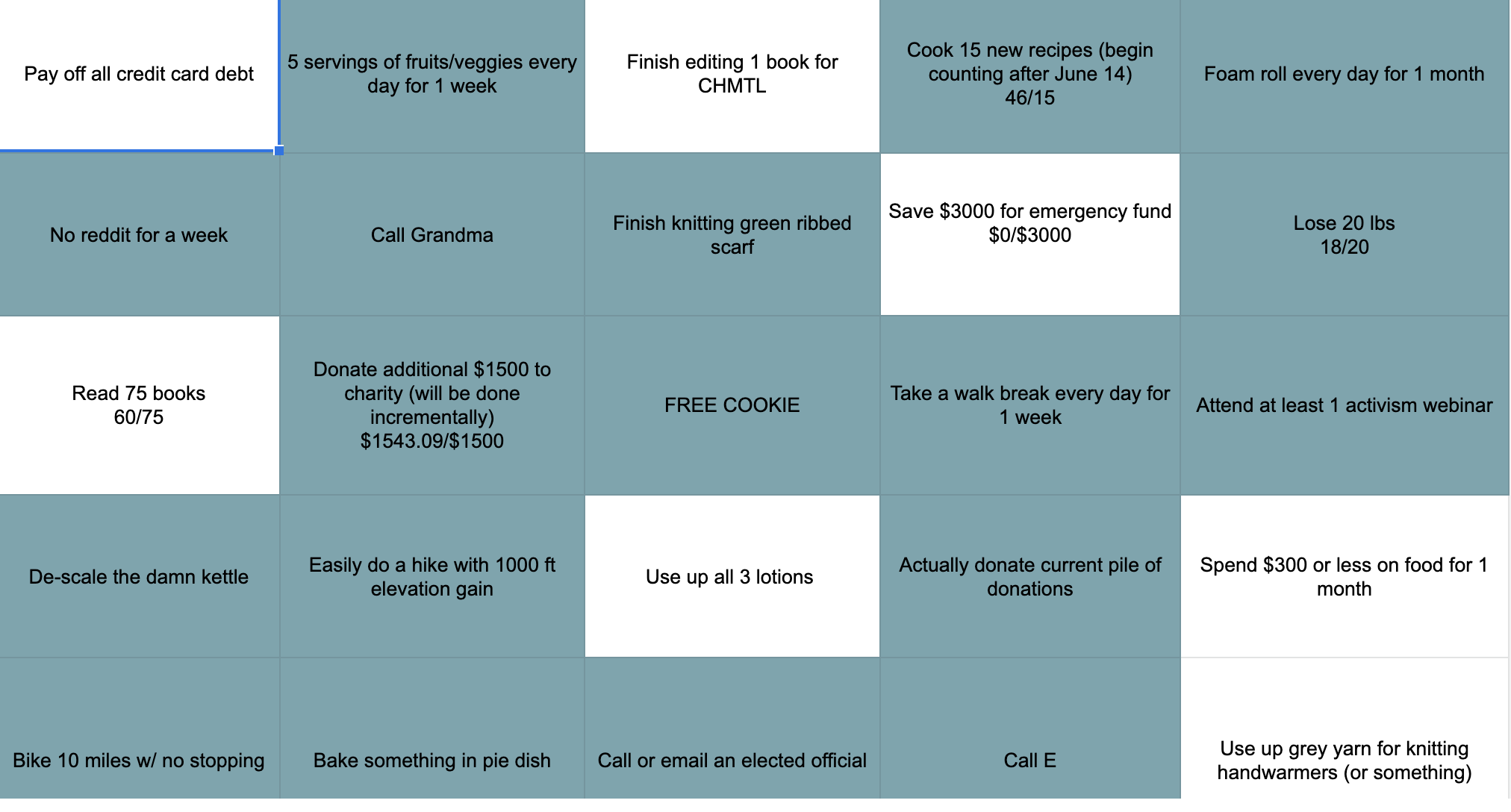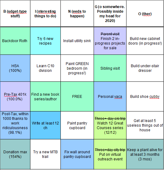 All right, closing out 2020 Bingo…technically got a couple bingos in December which tells me I should probably rearrange things for 2021 since a couple of the money things can’t happen until the last month of the year (HSA max, some 401k stuff), but I probably won’t