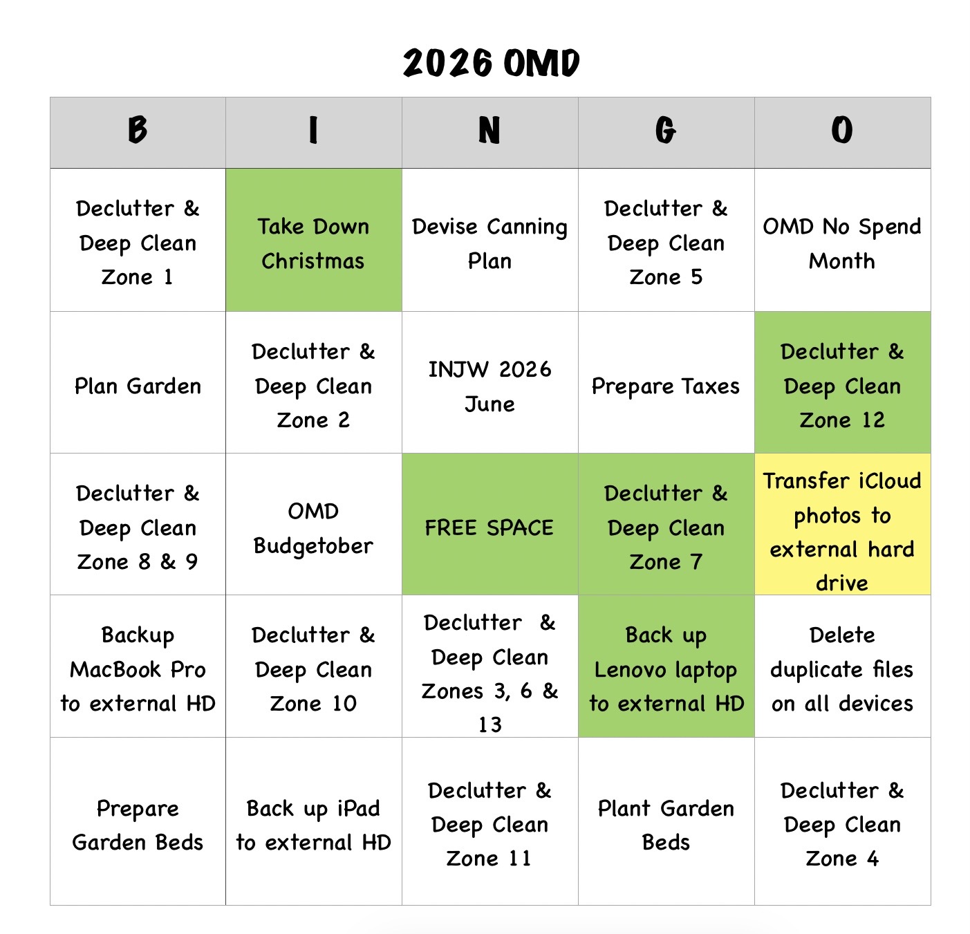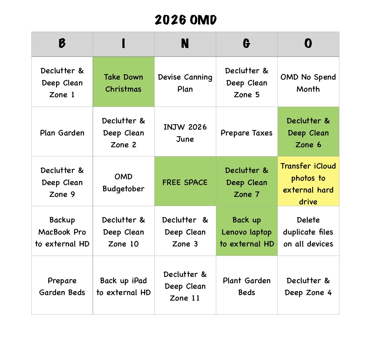 - Had a discussion with Hubby about which Zone to work on next. He suggested we do the living room. I discovered it is not on my Zone charts! So another Zone will be added to my planner, but not my BINGO card (because there’s no room for it).