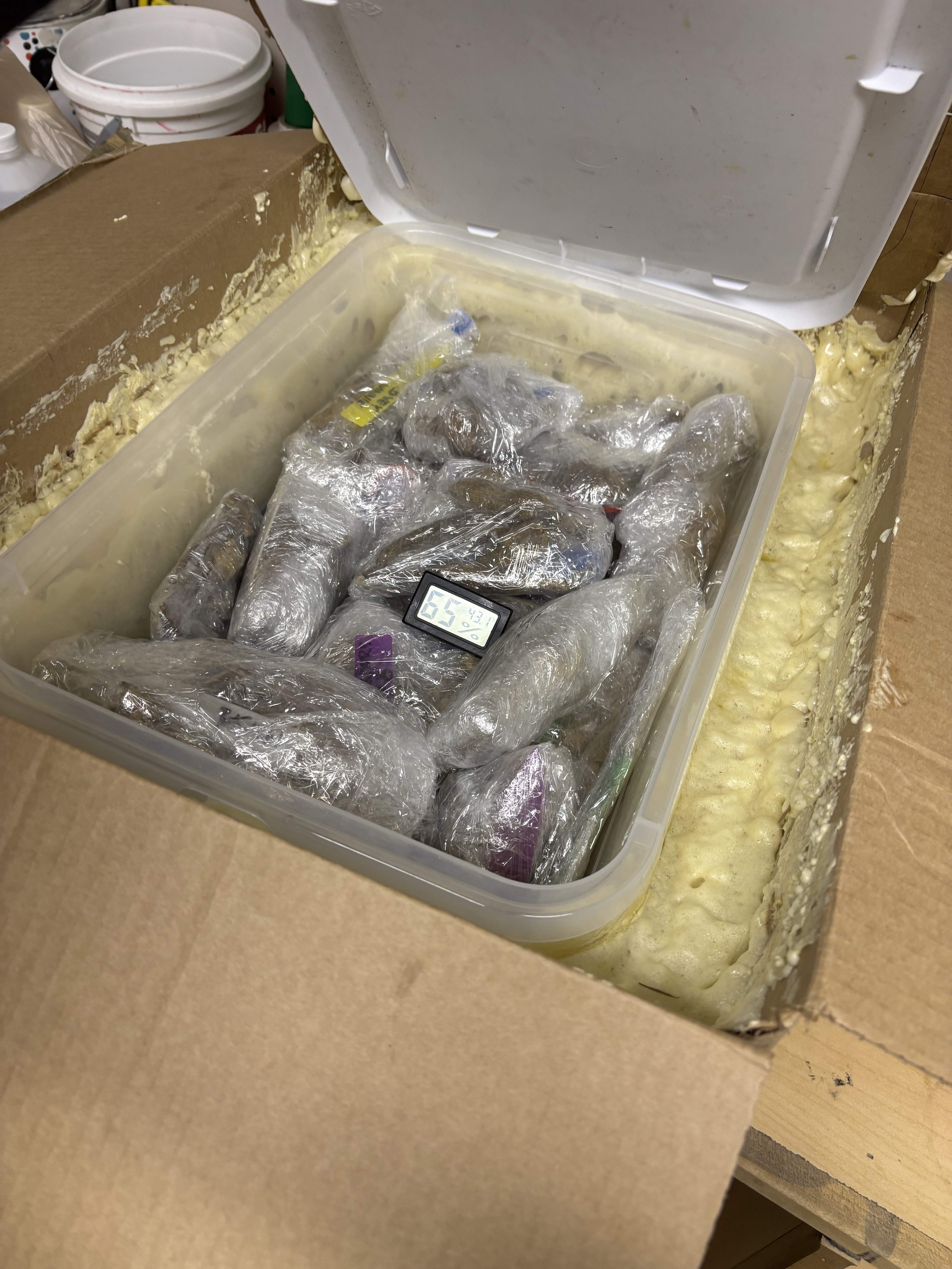 i would probably insulate them by putting the bin in a bigger cardboard box with paper or bubble wrap wadded up between the bin and the box and leave them in the warehouse, checking on them once a week or so, but i’m no expert!
