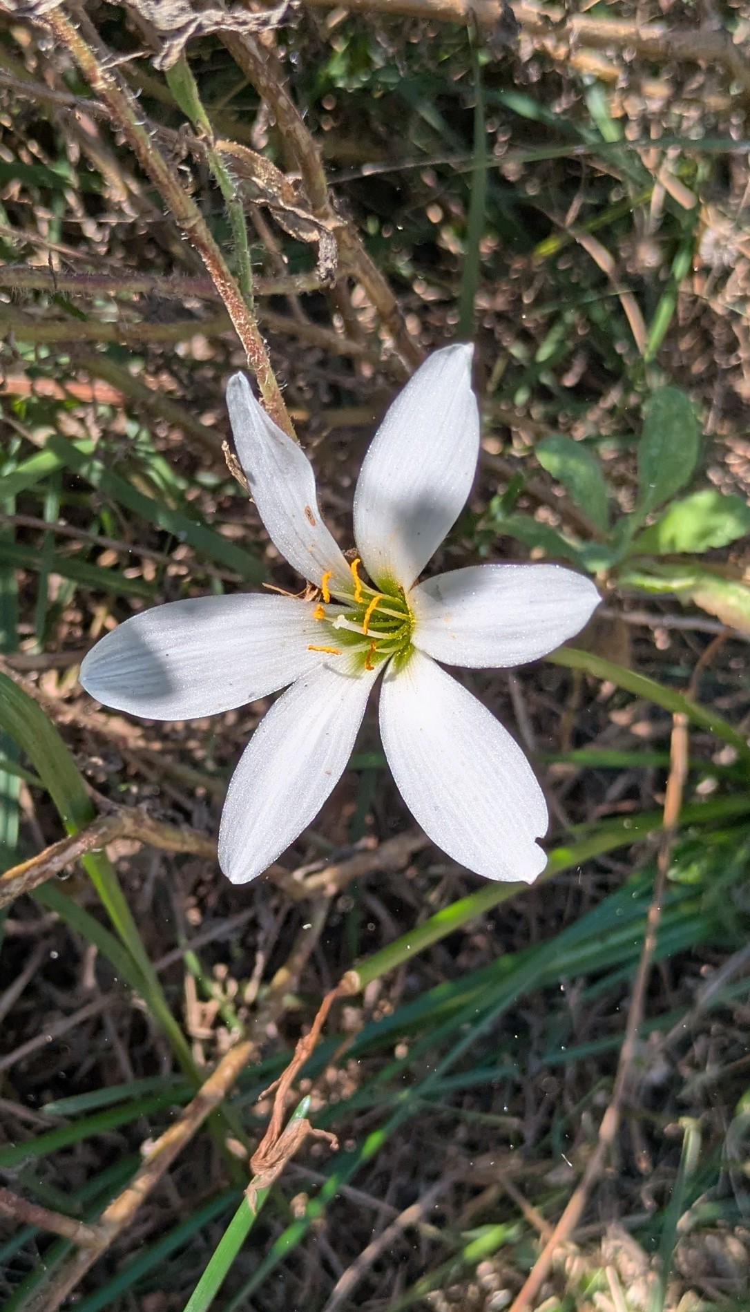 A rain lily peaking up through a bunch of blanket flowers that are dying back at the end of their season.