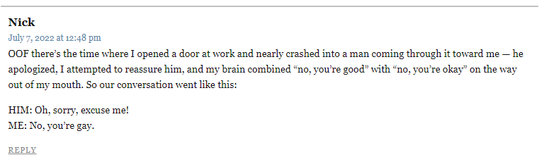 Ask a Manager is asking for submissions about mortifying moments at work (let's talk about your mortifying moments at work — Ask a Manager) and this one is absolutely killing me!