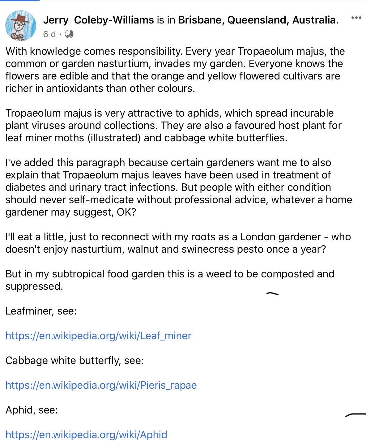I like Jerry and he lives in the same city so is geographically relevant. Sometimes I don’t agree with him but concede that he is far better educated and experienced than I, is he right about nasturtiums?