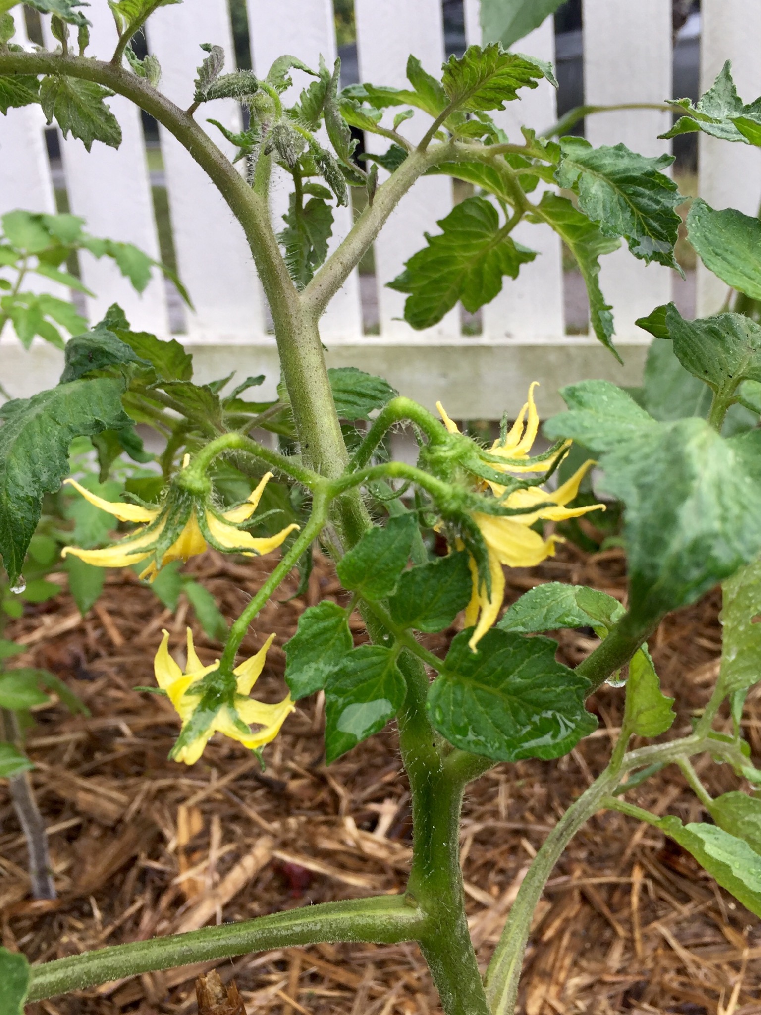 Tomatoes. Little ones have unripe fruit. Big ones flowers. Maybe we will get some tomatoes after all.