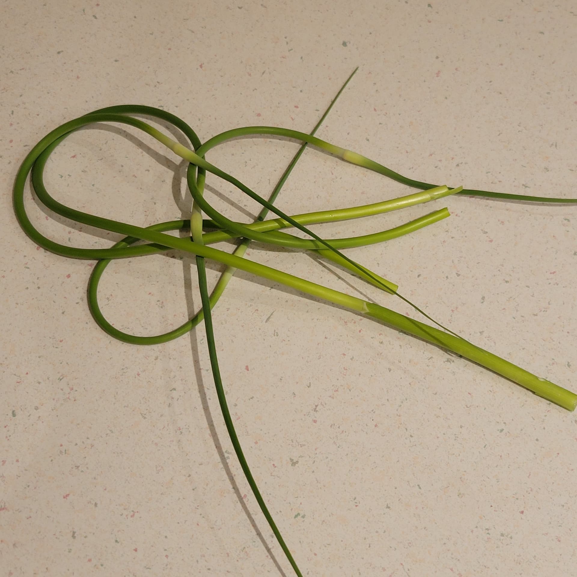 First to harvest garlic scapes was Charlie’s Sicilian. Substantially more vigorous than the Sicilian variety one row over.