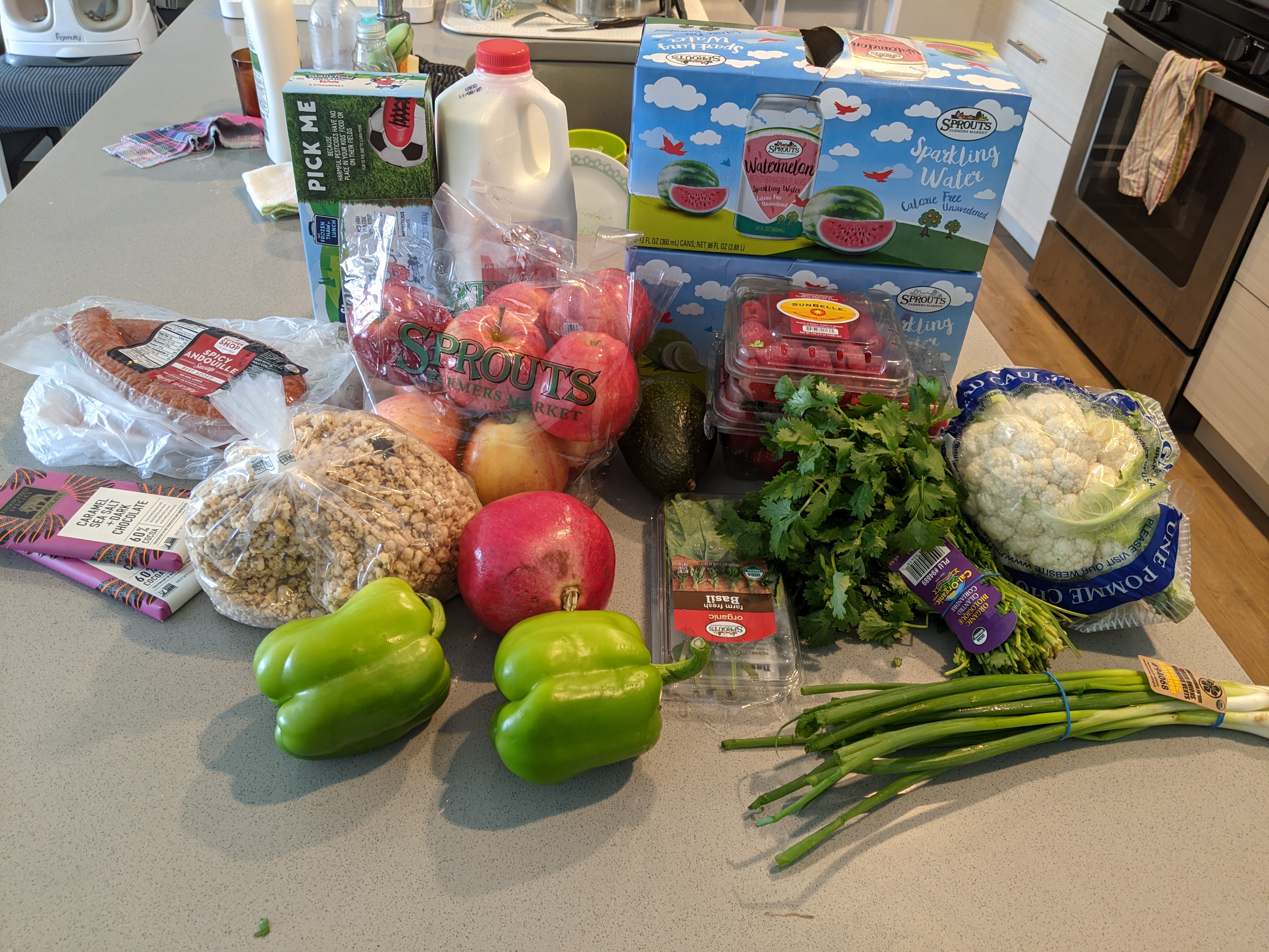 My haul for our no cooking, snacks only week (plus a little stocking up for when we do cook again): $102.50. I sure hope this lasts longer than a week. We’re working on some house projects that have a deadline so no cooking until that’s done.