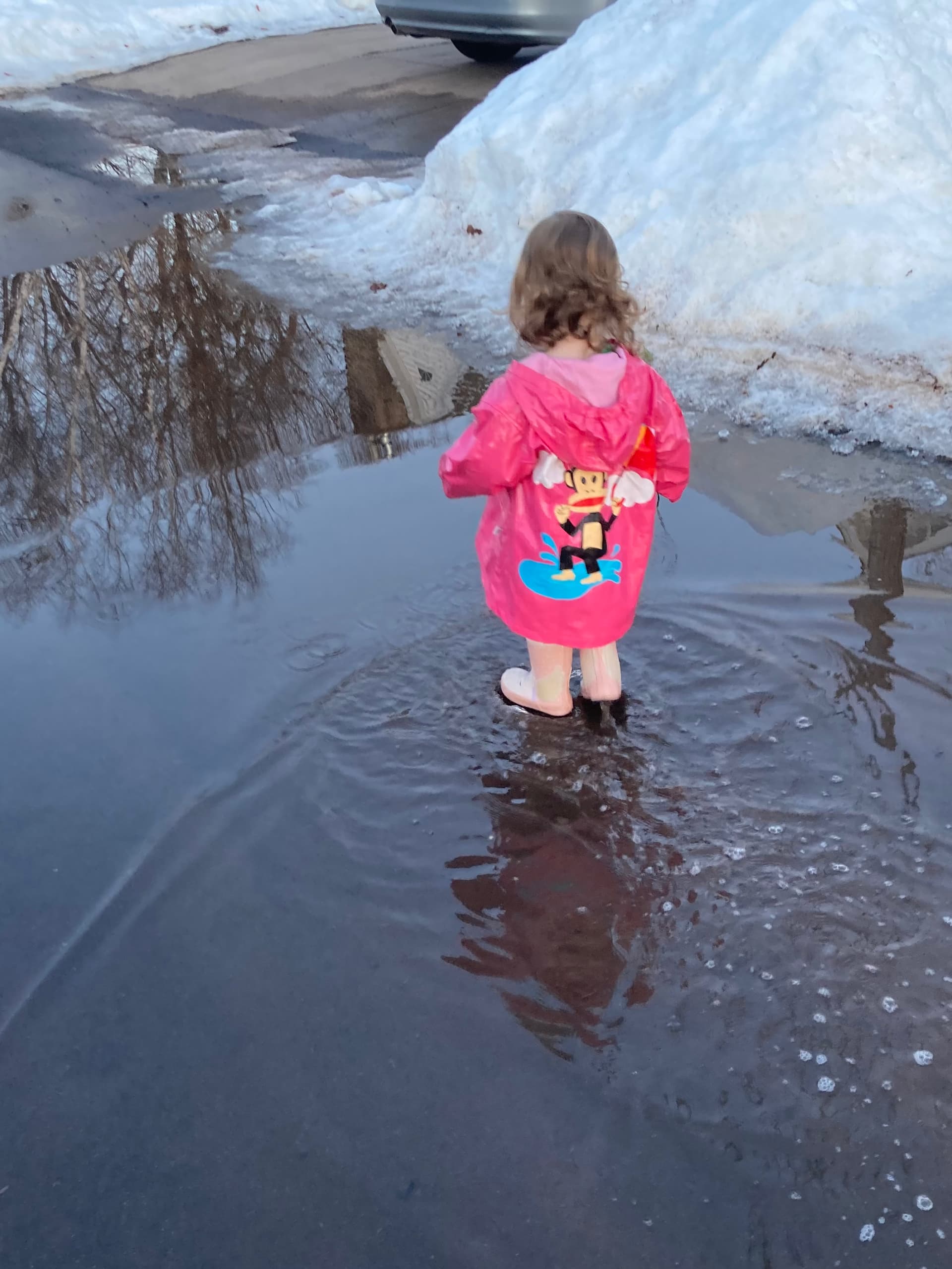 After a stretch of cold and travels, it is now warming up. Today she was home sick and miserable, but perked up for 30 minutes outside to splash in a huge ice melt puddle, push water around with a shovel, watch the curb creek flow into the drain, and try to go see friends (they were already in bed). She needed to be carried home, poor thing.