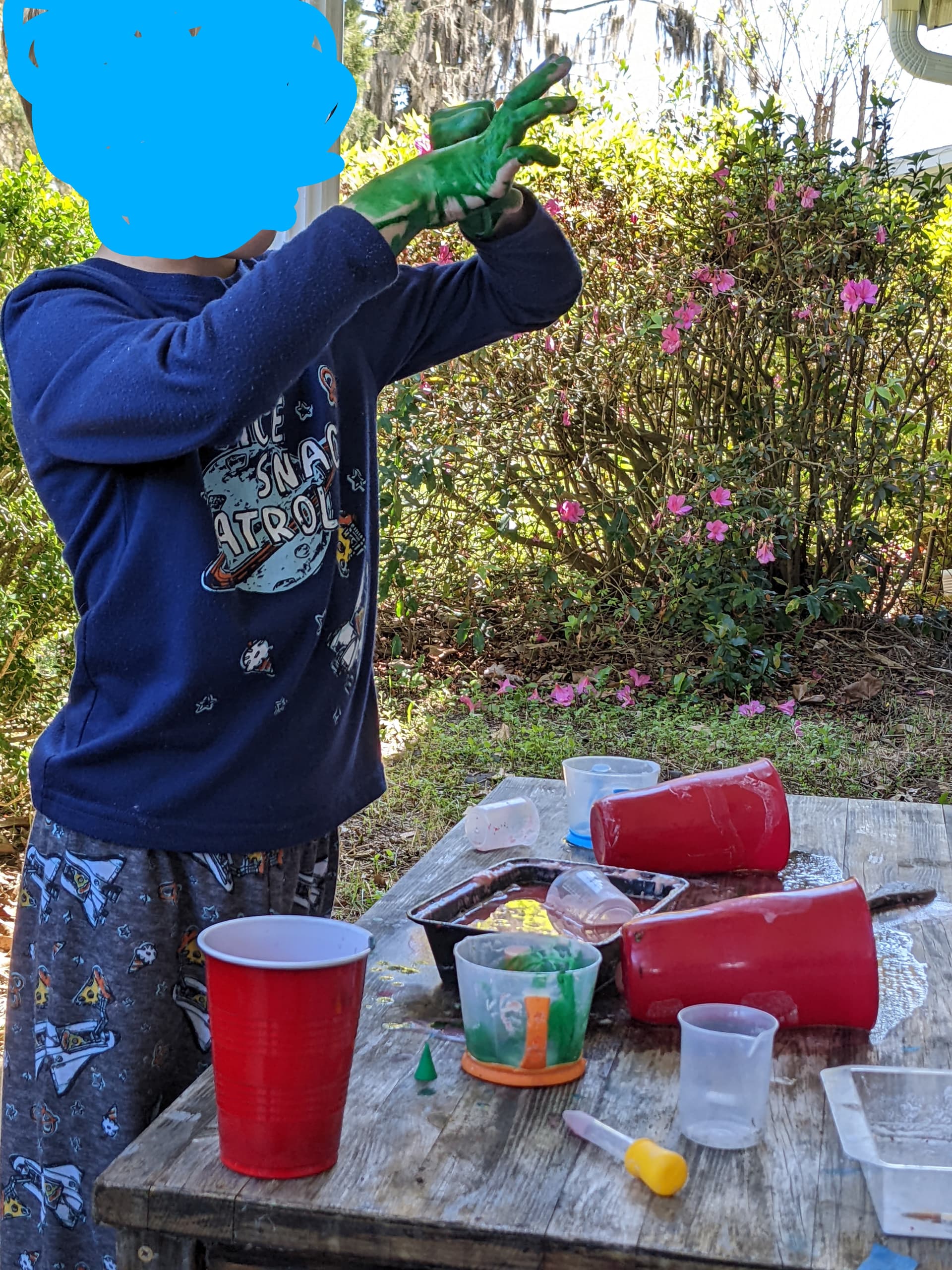 I forgot about doing āscienceā outside. I let Kiddo have what was left of a tiny thing of green food coloring ⦠And now he has Hulk hands. I already have a bucket of soapy water standing by.