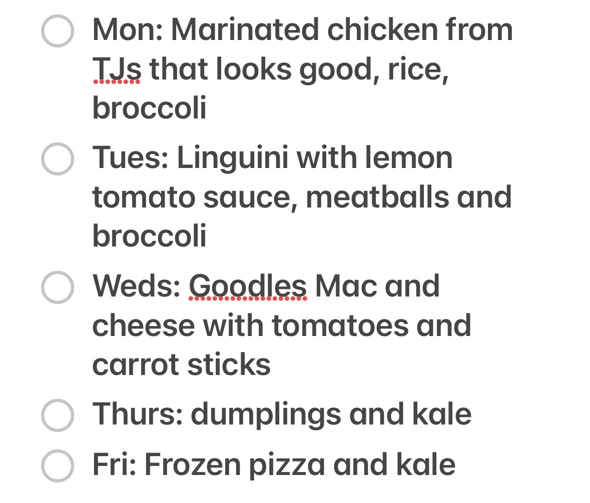 I’m not sure I totally succeeded at following our meal plan so far but we’ve been successfully not eating out for dinner for two weeks now? Maybe 3?