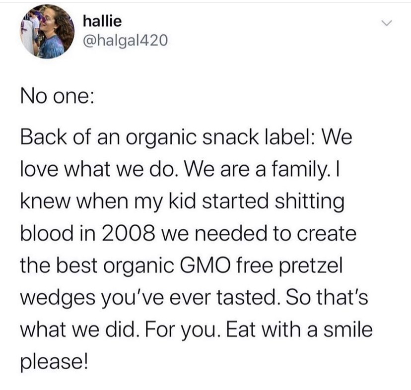 Omg the organic snacks one made me cackle