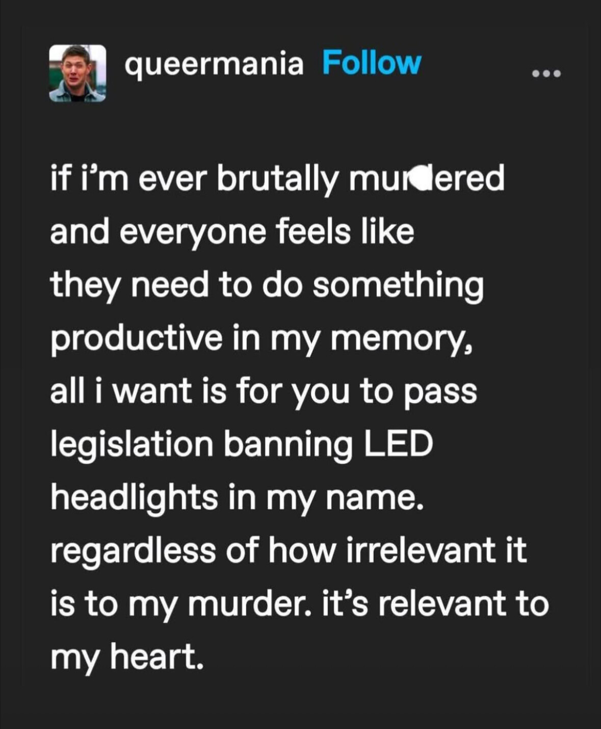Yes thank you are we able to ban the LED headlights without a murder or is that a requirement?