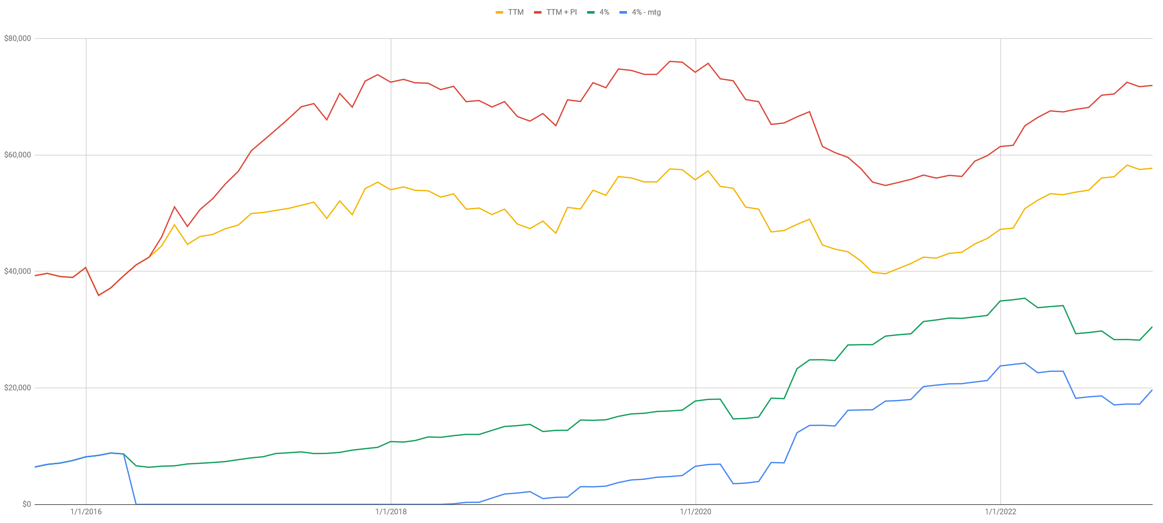 (red) TTM + PI: The sum total of ongoing expenses from the 12 months leading up to the point in time, including the Principal and Interest of my mortgage. Basically a way to see rolling average annual expenses. Any one month can only pull the average, but consistent control of expenses is necessary.