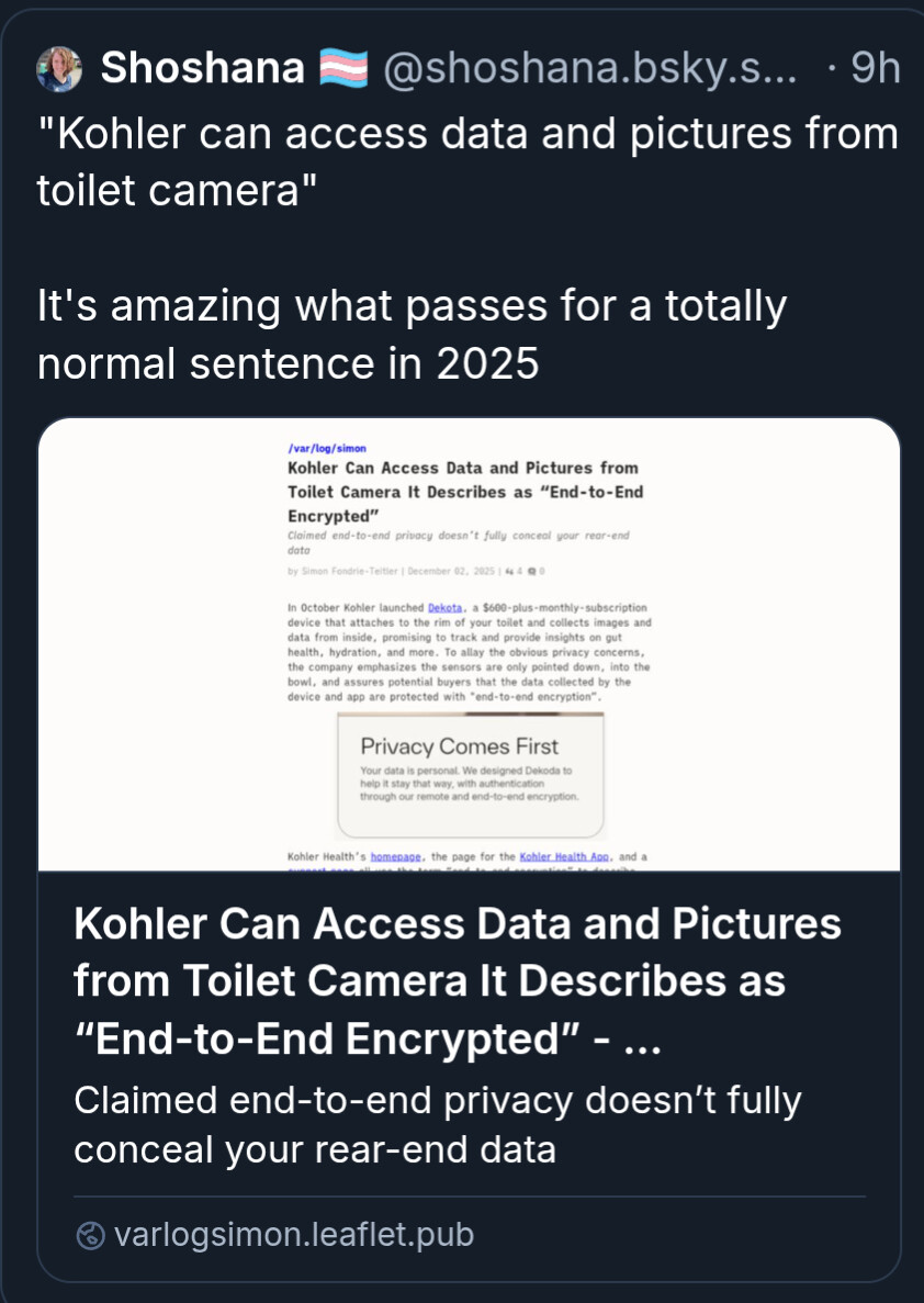 In October Kohler launched Dekota, a $600-plus-monthly-subscription device that attaches to the rim of your toilet and collects images and data from inside, promising to track and provide insights on gut health, hydration, and more. To allay the obvious privacy concerns, the company emphasizes the sensors are only pointed down, into the bowl, and assures potential buyers that the data collected by the device and app are protected with "end-to-end encryption”.