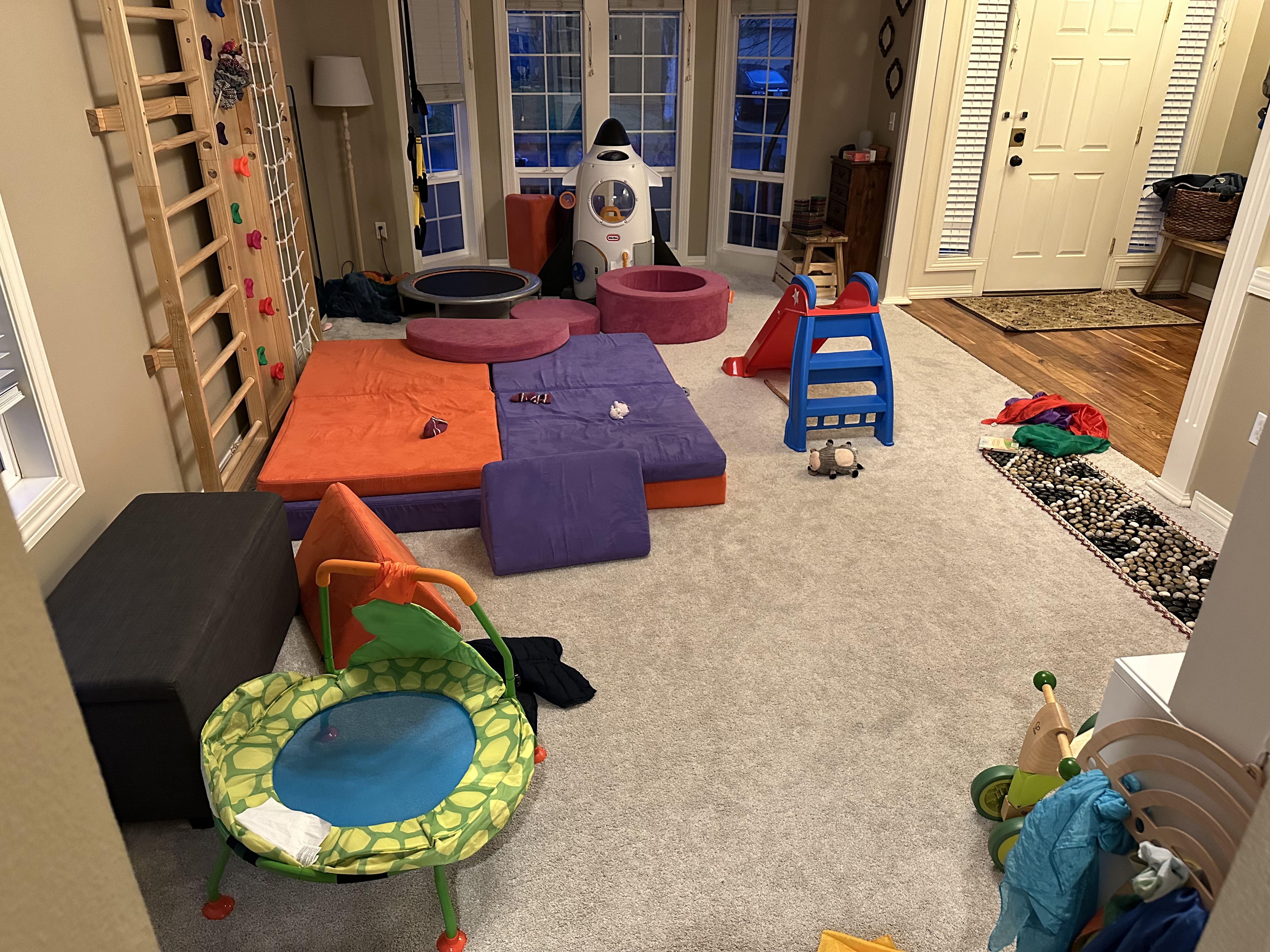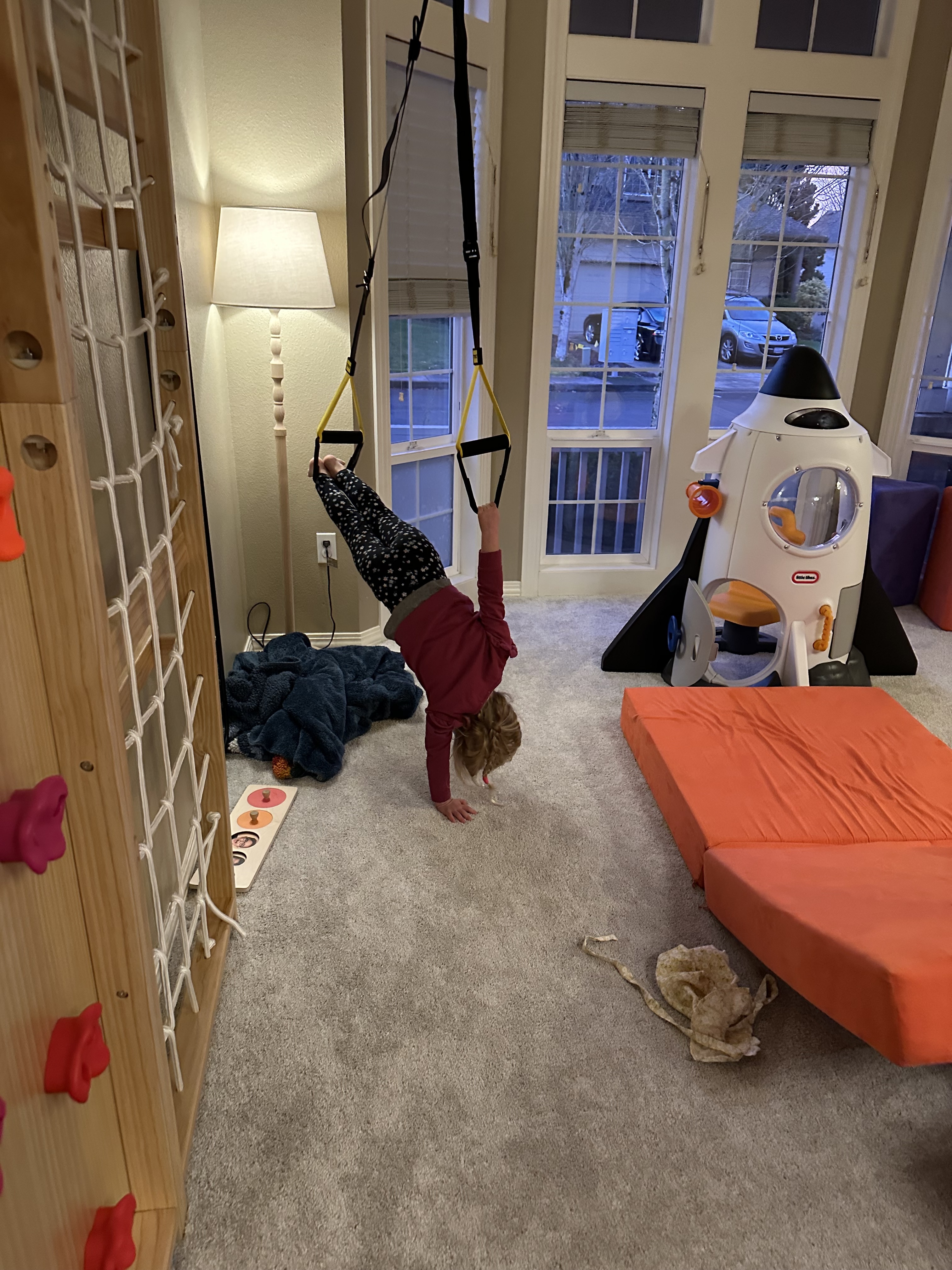 Yep. As you know, having seen pictures of my house, we are now up to three play couches and one play ottoman. And of course, the wall of my front room being a climbing gym and what have you. Oh, and the ceiling mounts with the trapeze attachments. And the tiny trampolines.