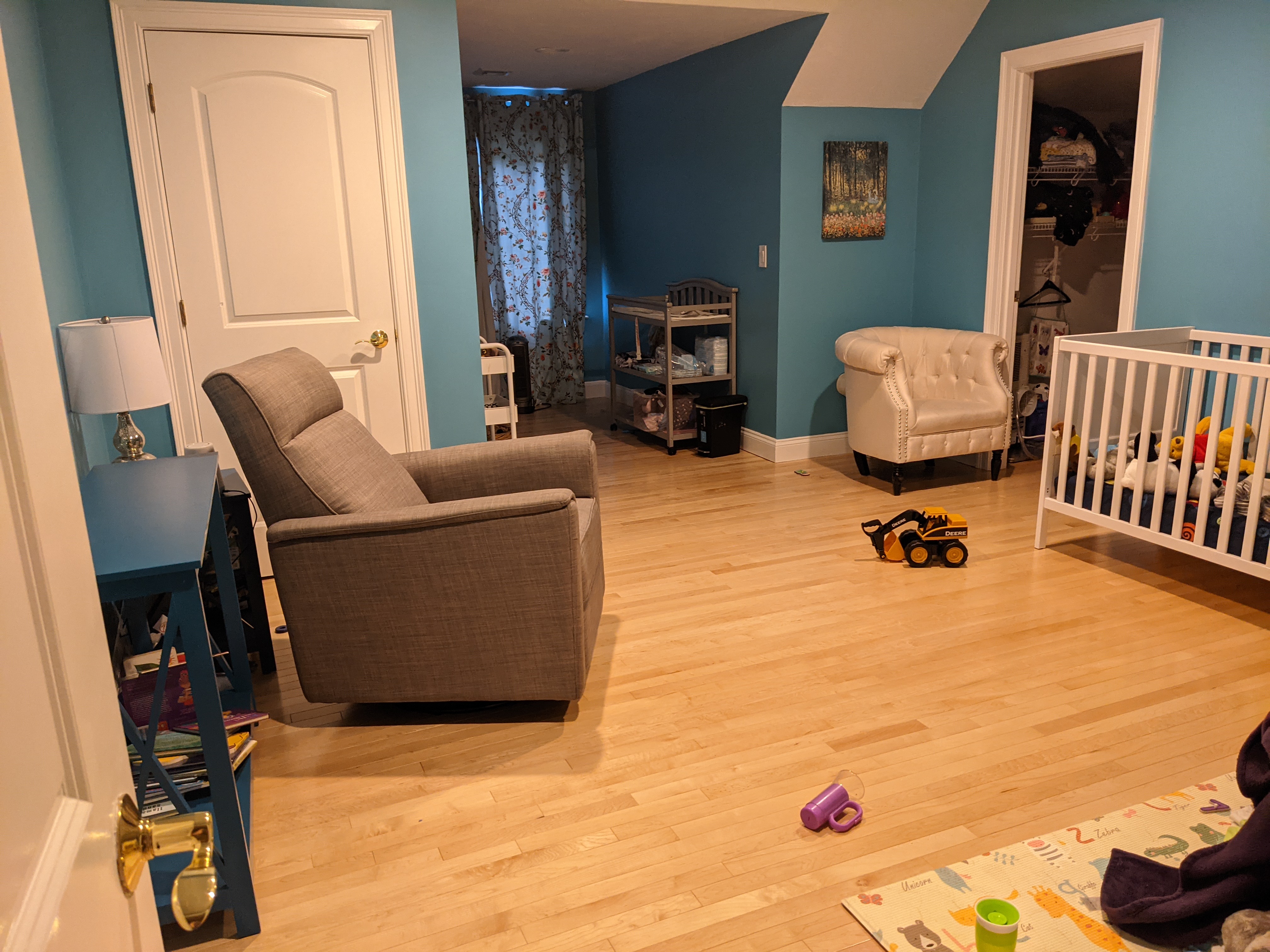 Thanks for these suggestions. The crib turns into a toddler bed so we need to convert it. We are going to take out all furniture except the rocking chair and a small bookshelf that is attached to the wall. We are going to put the wires behind the bookshelf out of reach.