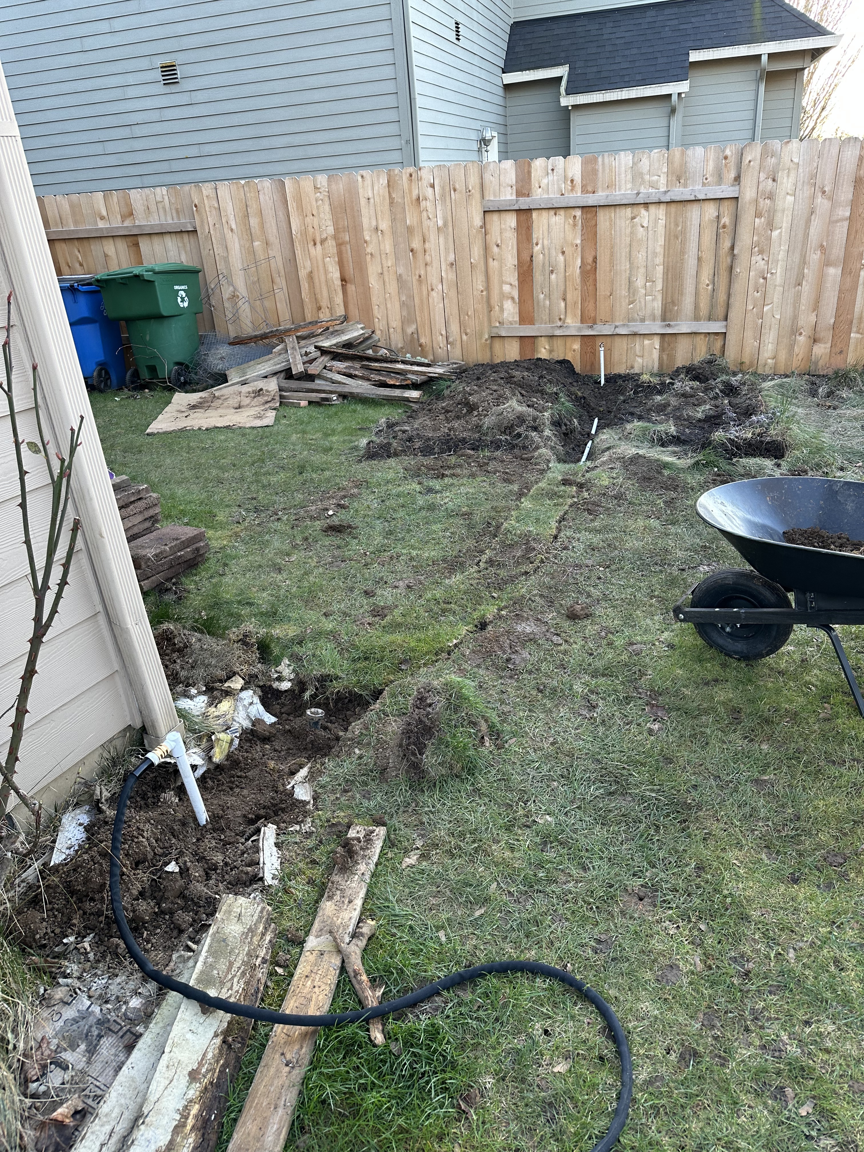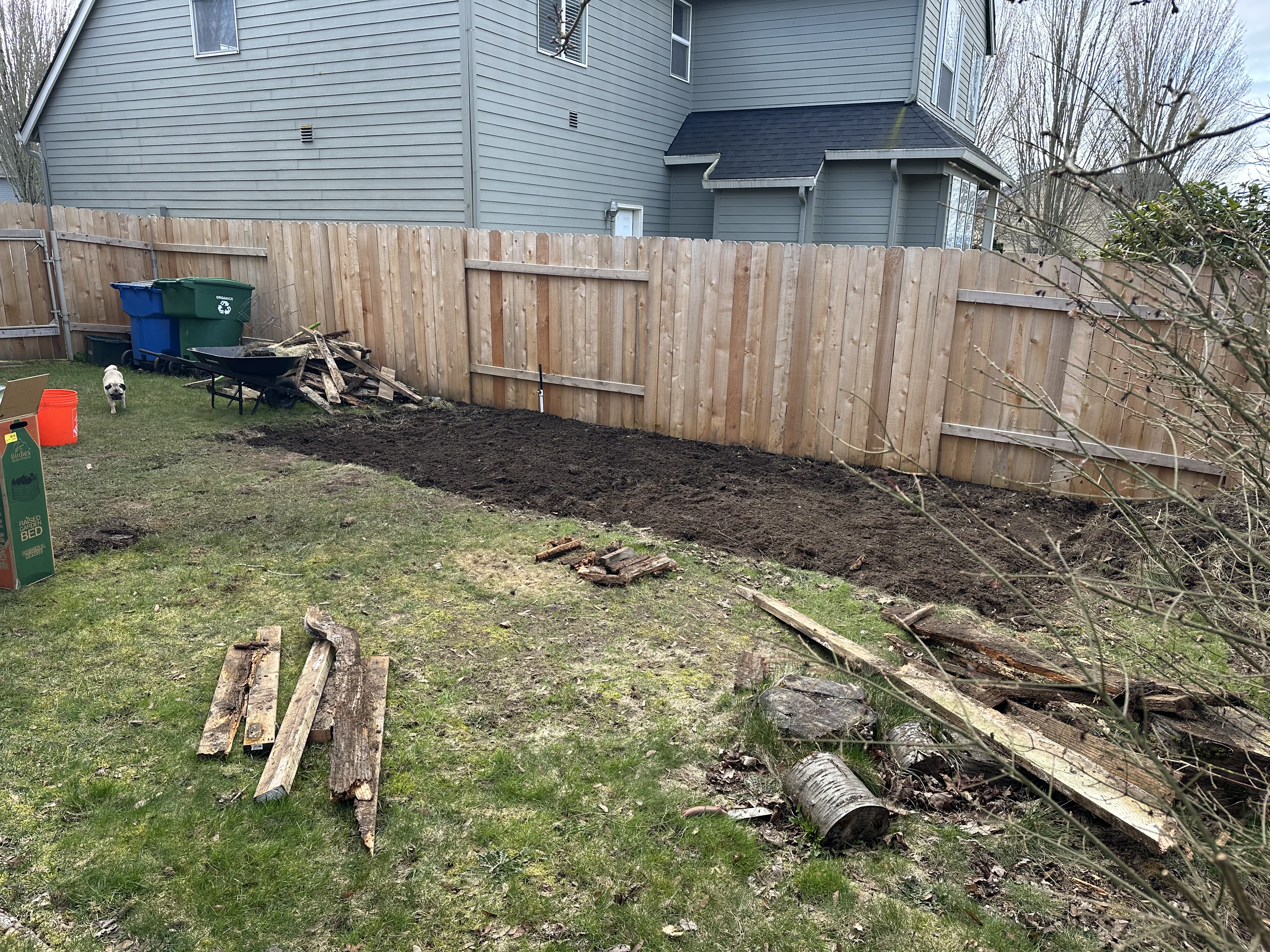 Here’s the area with the sod and beds all pulled out and sort of leveled ha ha, plus the trench covered back over where we ran the PVC line to bring a water tap out to the garden. We also added a French drain through the middle under all the beds, to try to counteract some of the drainage issues with the dense clay we have here.