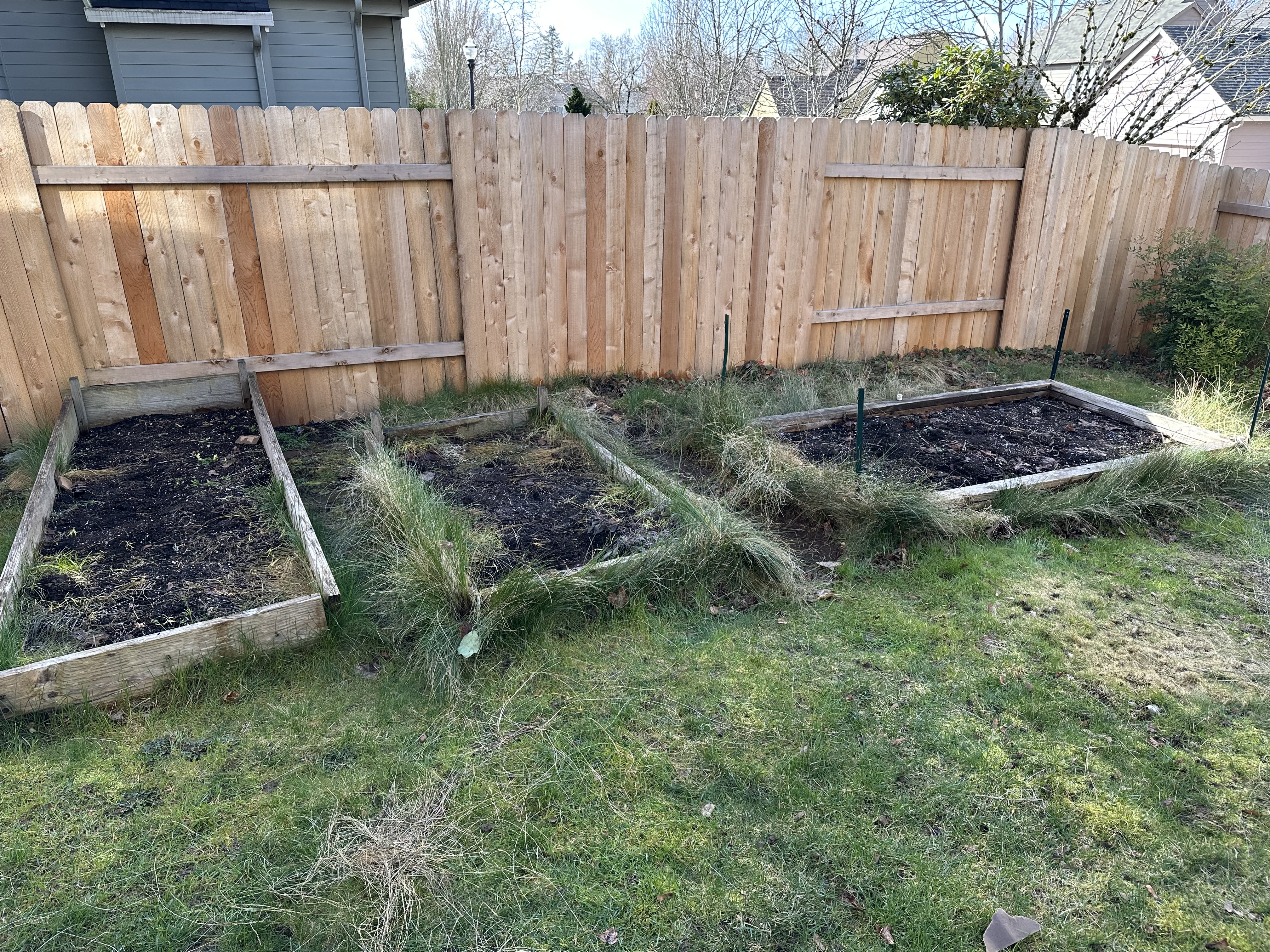 Okay here’s the before. The wood was rotting so bad there really wasn’t any way to trellis stuff in and tons of bunny issues. The biggest issue of all was grass infiltration and no way to remedy it- that became way more clear why as we removed them, there was straight up grass roots, running through the punky wood on the edges. Literally never had any hope of trying to get the grass eradicated.