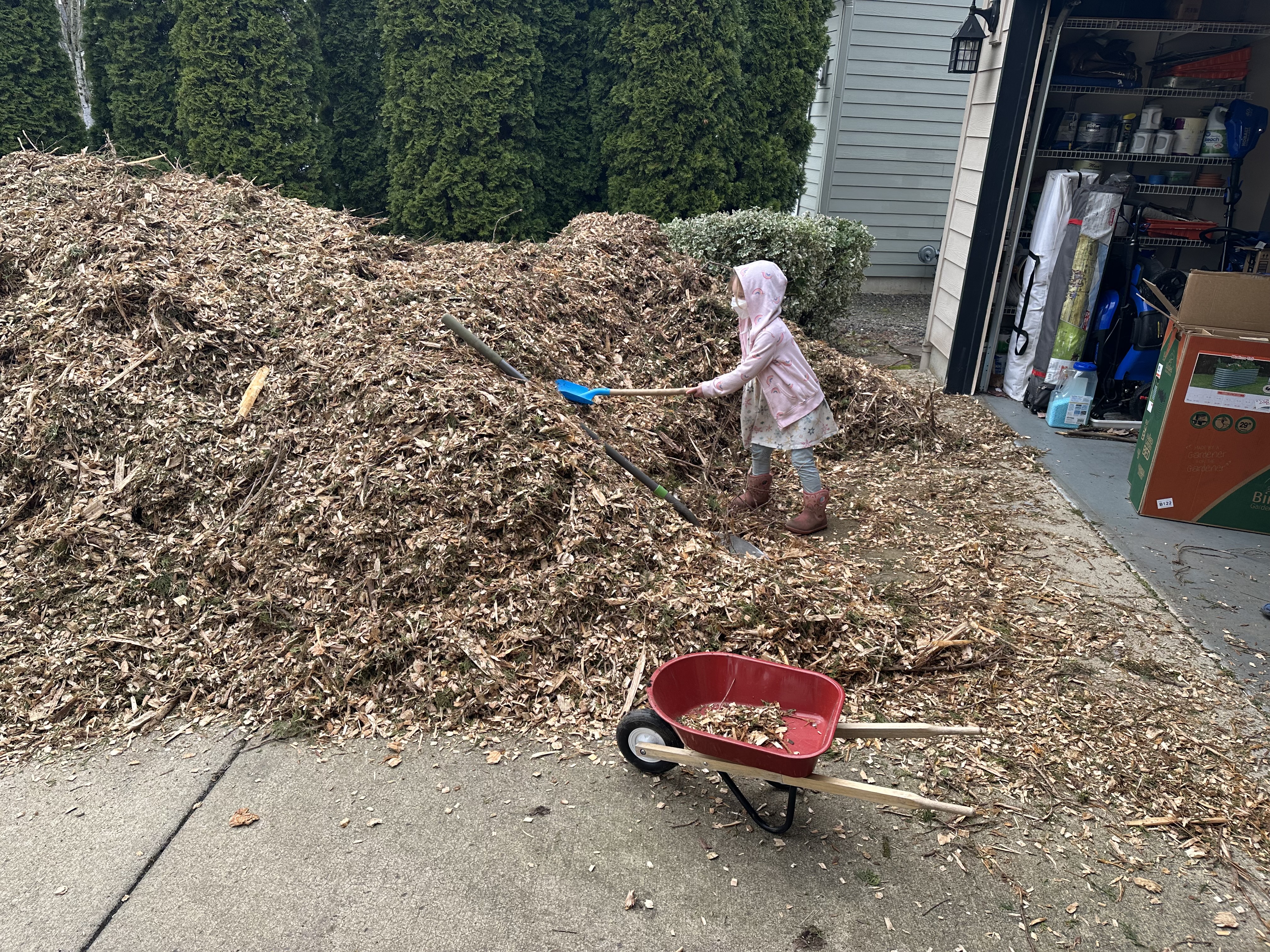 We did a chip drop in order to fill the bottom half of the beds and go around it for weed suppression in the area. Here I am using latte as child labor