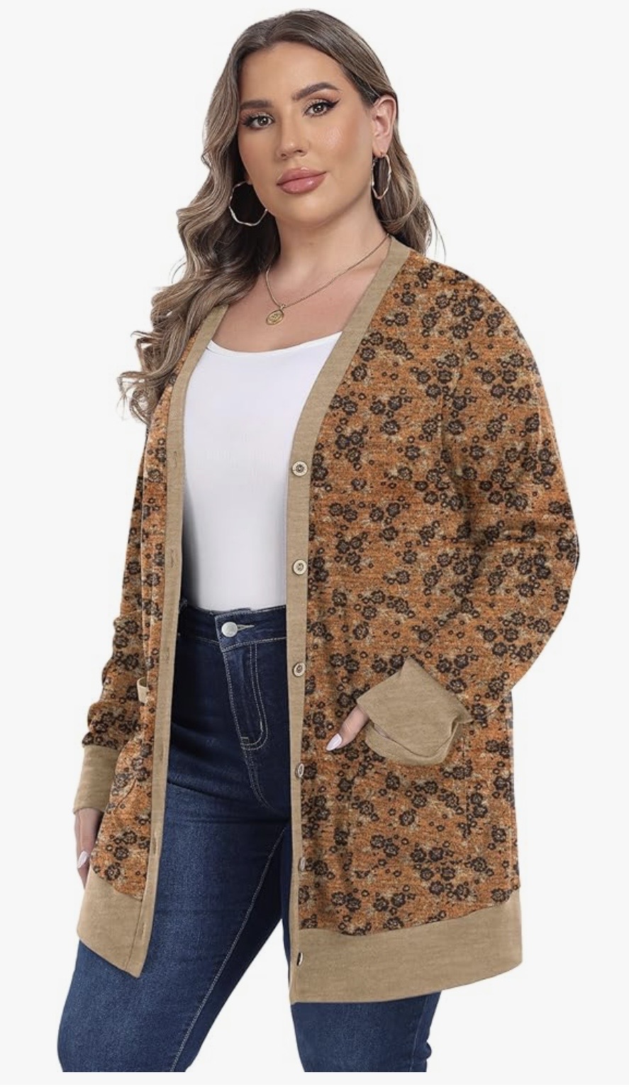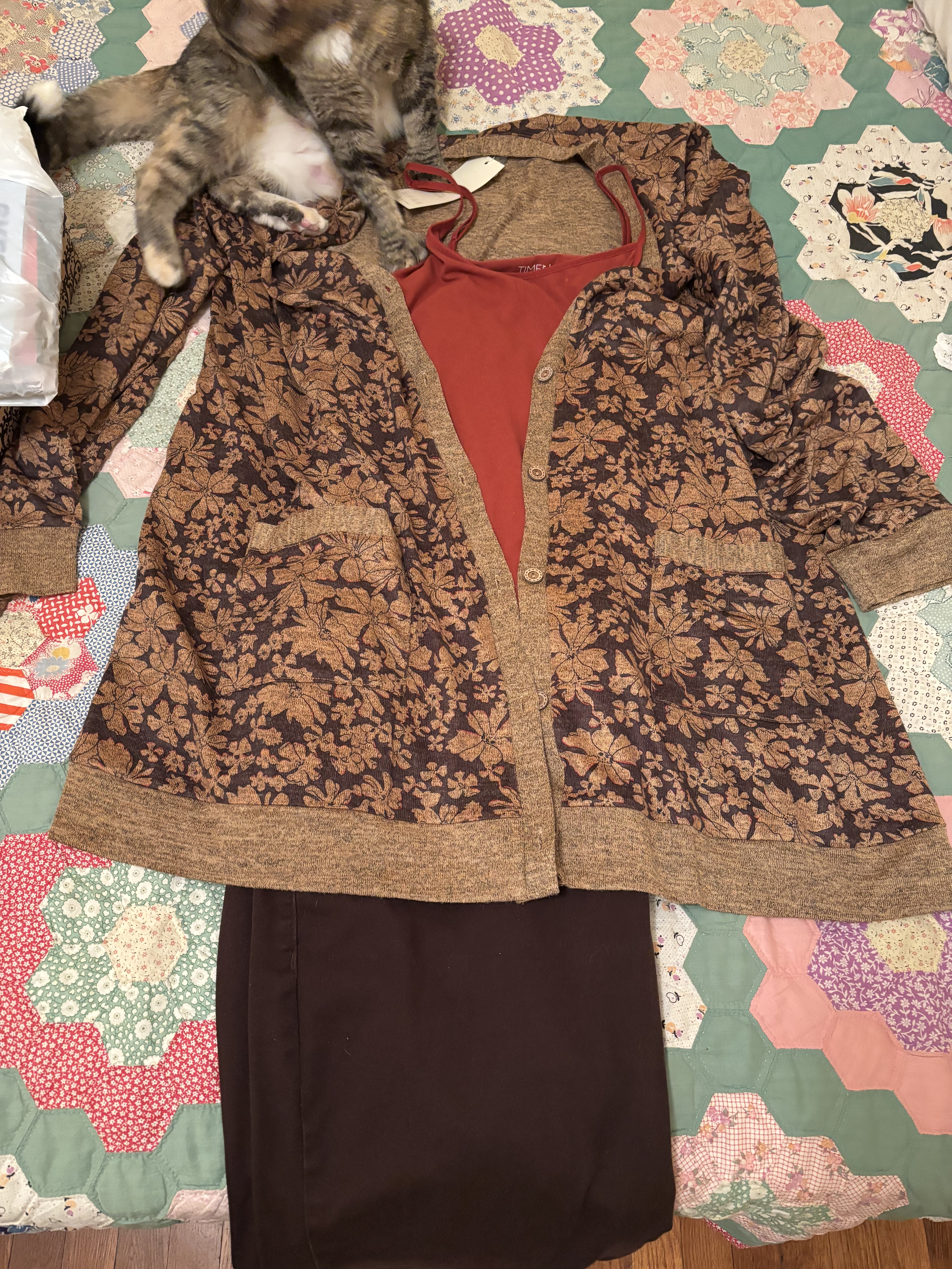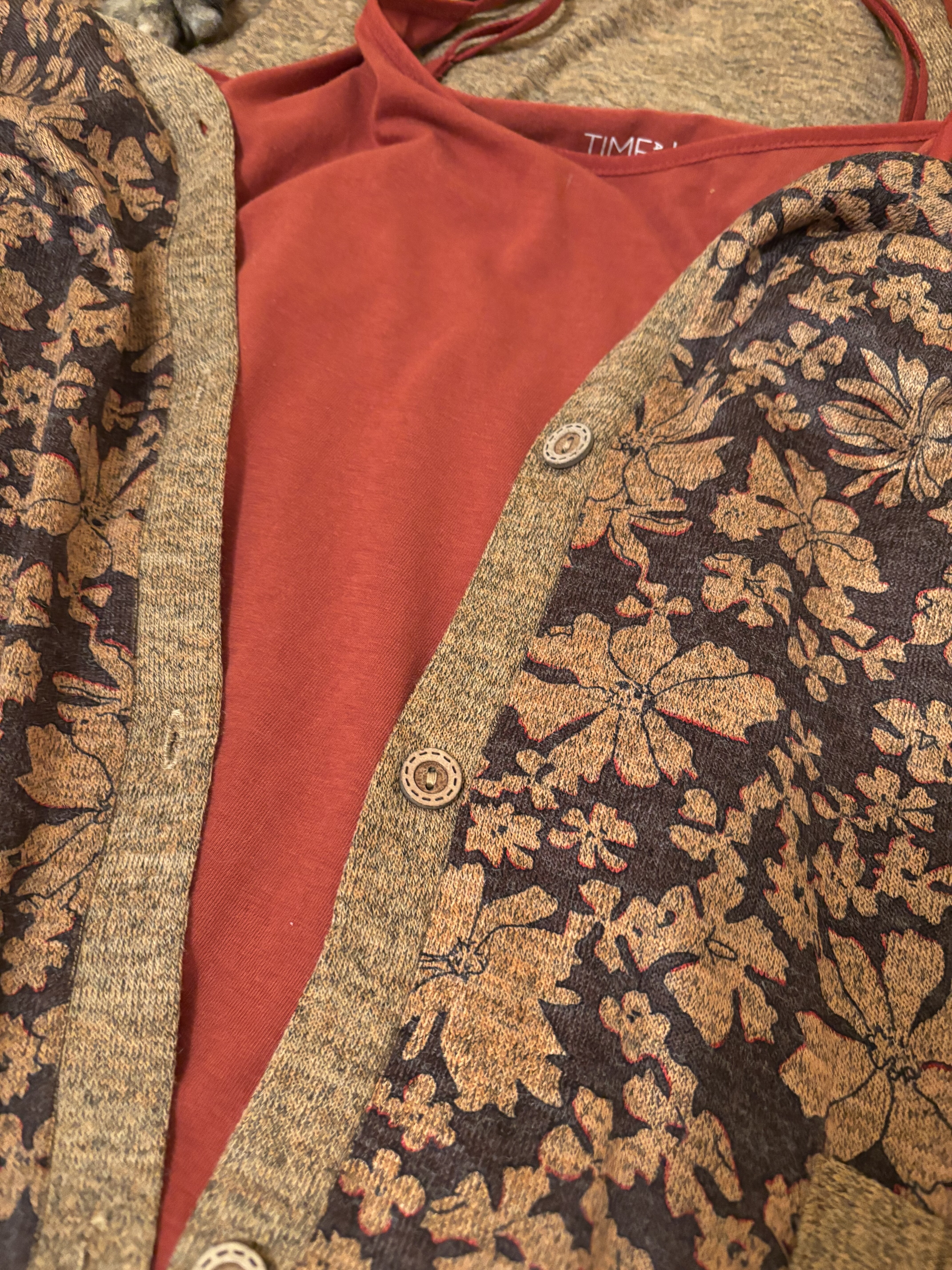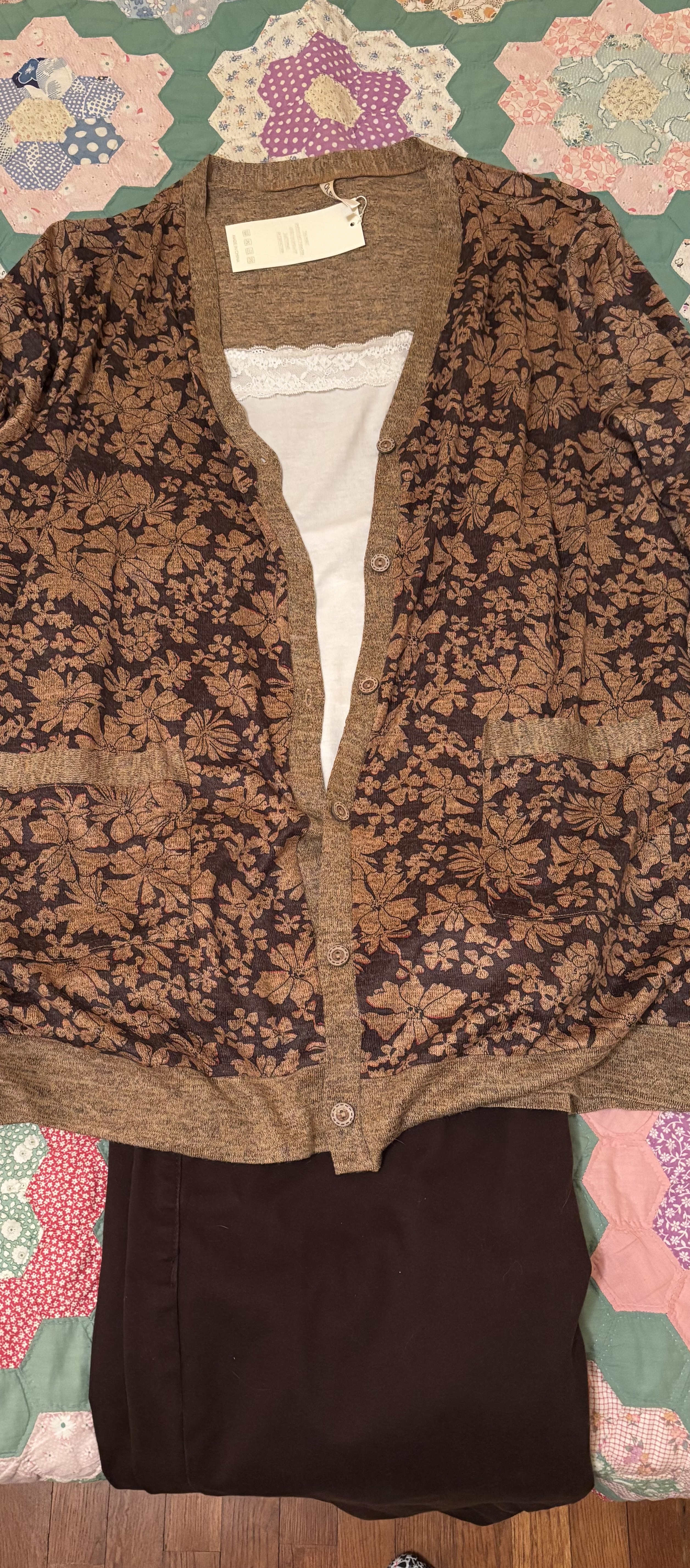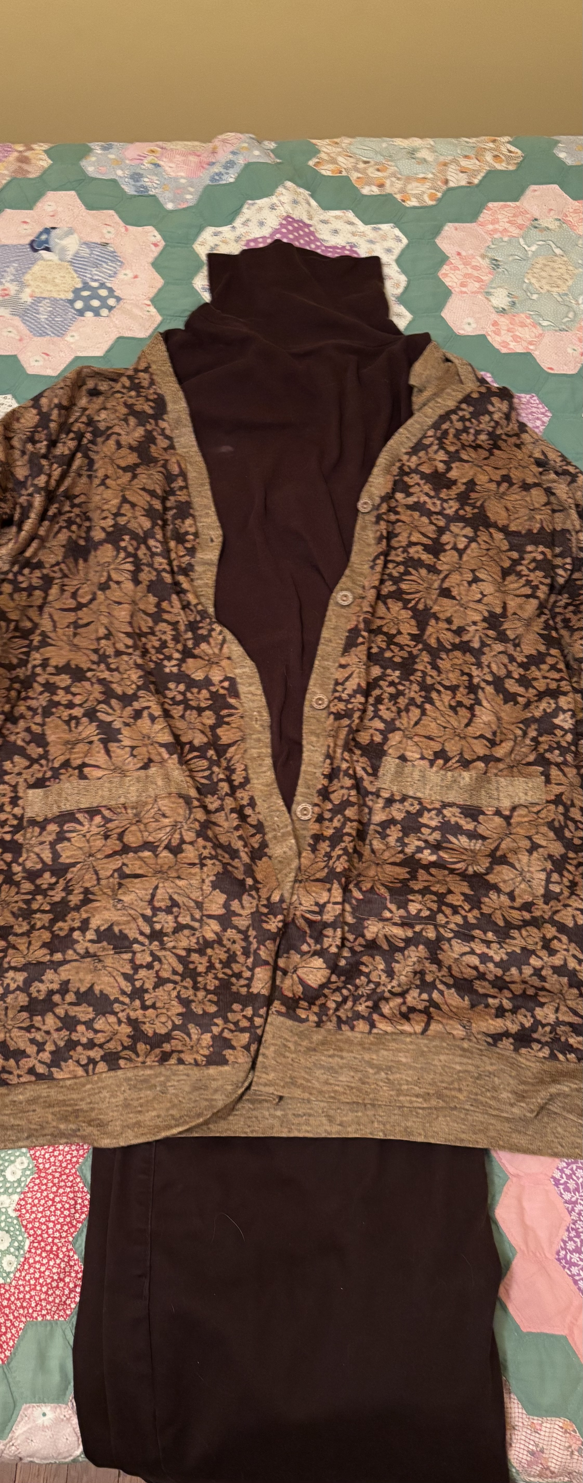 What looks best under this sweater and with dark brown pants? There is a tiny bit of orange around the flowers. Are the cream items too bright/stark? I think a new/not faded brown turtleneck would definitely be better and will get one. I could also get a dark brown cami if that works. The sweater is super lightweight so I’d like to be able to wear a turtleneck with it this winter and a cami when it warms up a bit.