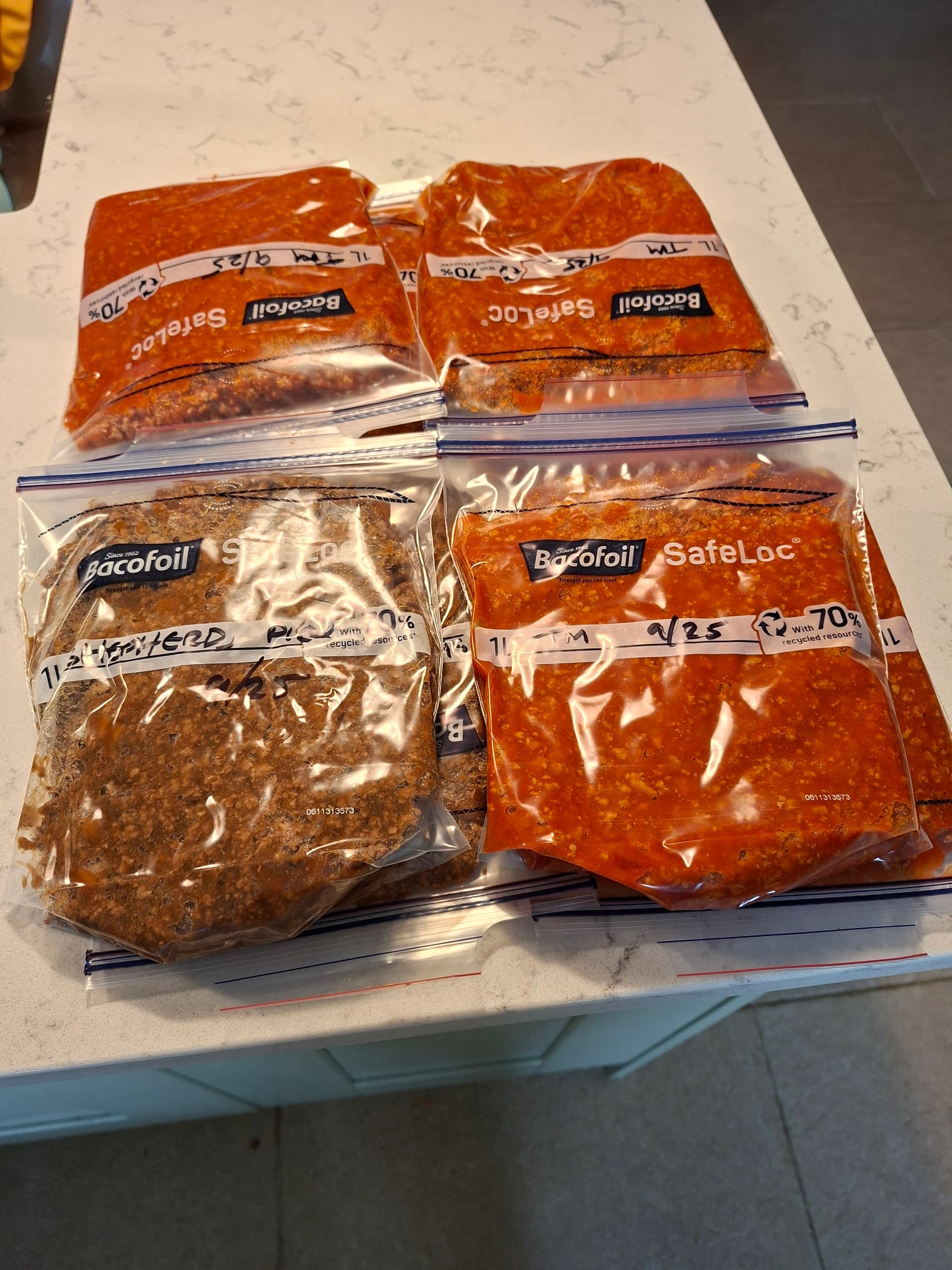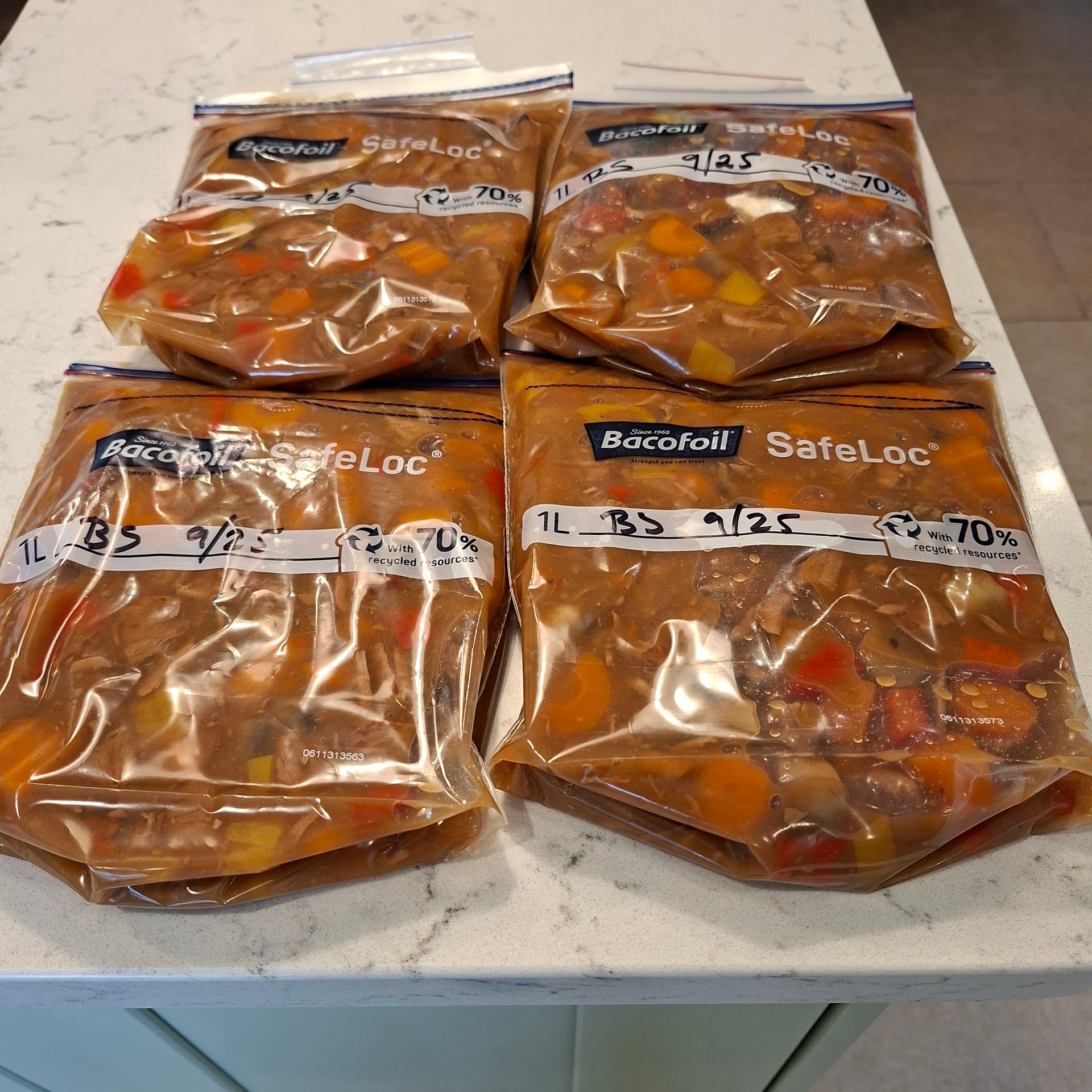 4 beef stew, 2 shepherds pie, and 6 tomato mince, all to be frozen flat in ziplocks so that 15 minutes immersed in hot water will have them ready to use with whatever the carb of choice is. The tomato mince is a base for bolognaise/chilli/keema curry depending on mood and available addins. Under three hours work all in, including clean up and freezer prep.