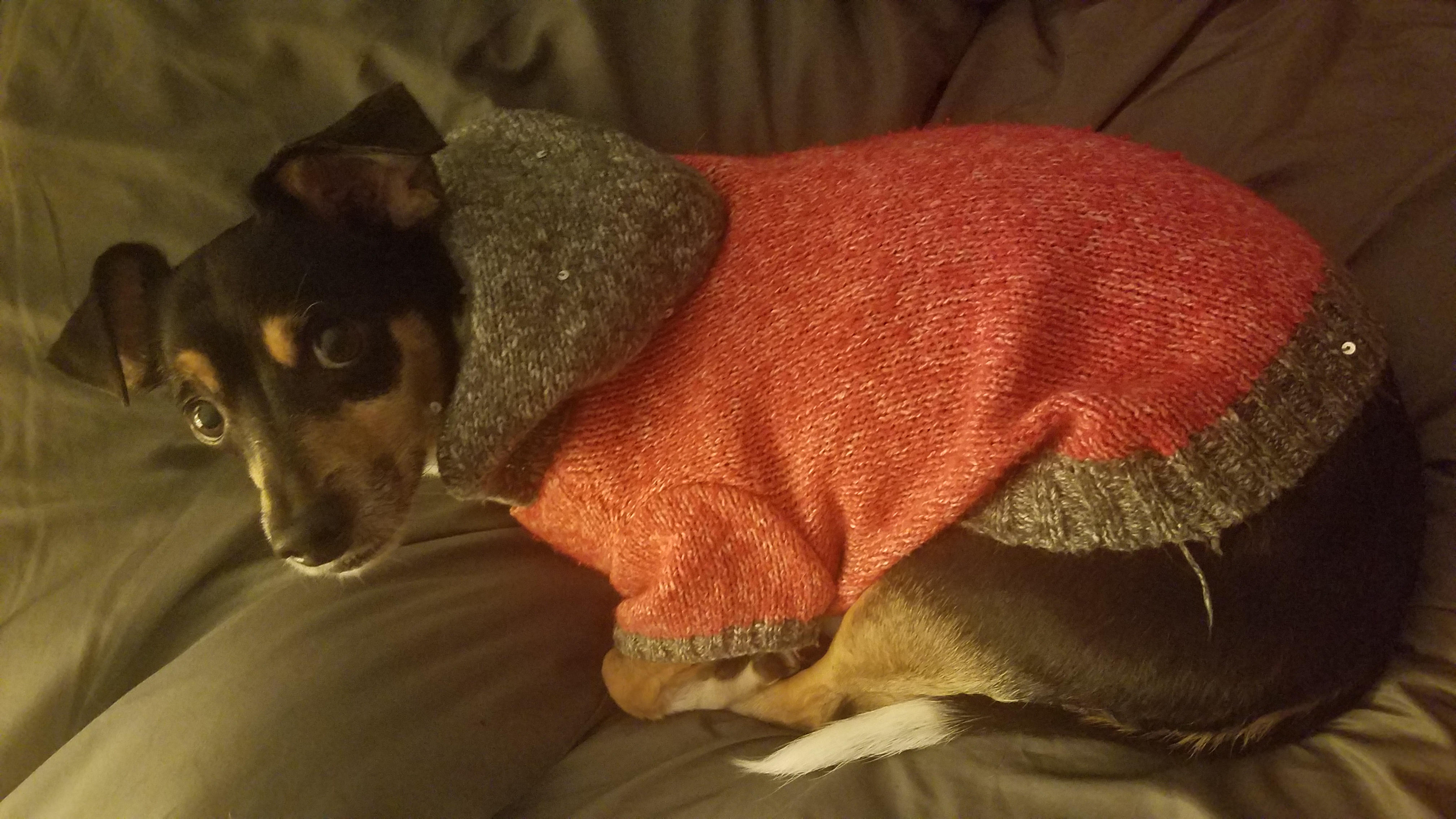- Here is Luigi in one of his pajamas tonight. He is my little model pupper.
