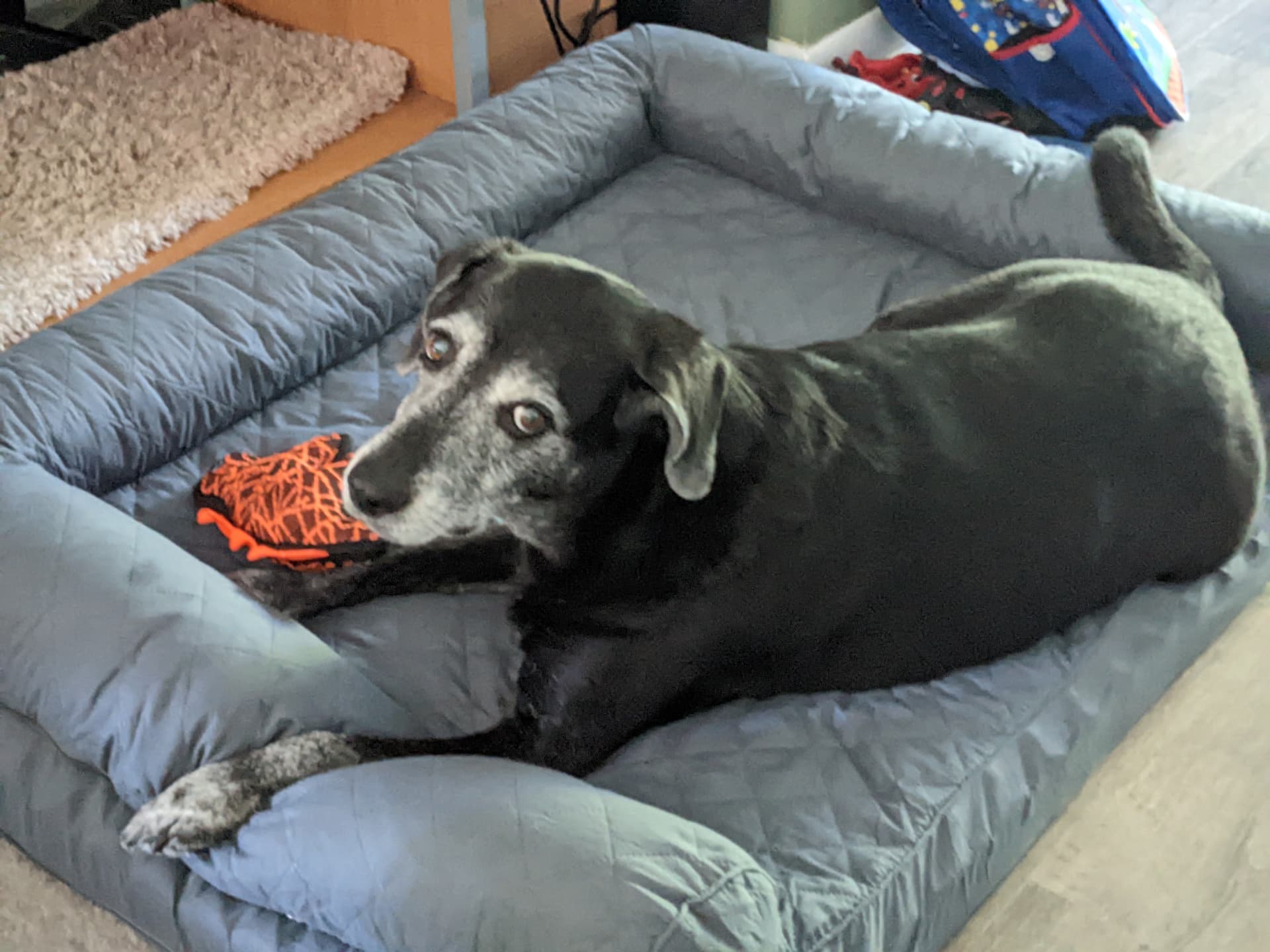 Percy is eleven years old today. She got a new cushy bed, a dinosaur toy, and several flavors of treats. She also got serenaded with happy birthday.
