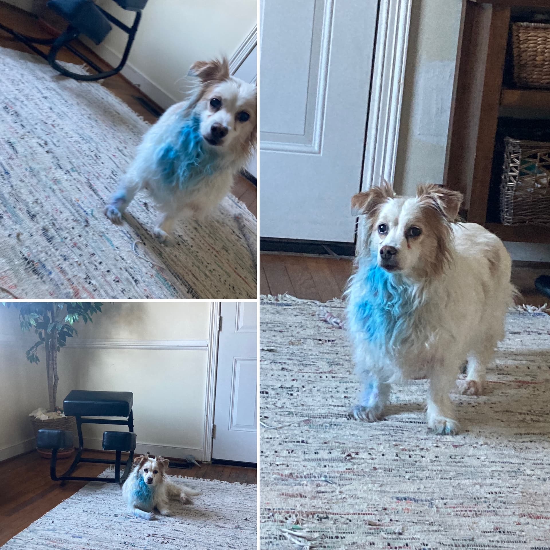 I sent foster pup back to the main house for a bath and sanitary trim today and while she was returned smelling great and with many fewer dingleberries, she somehow stepped in, and then sniffed a bucket full of sidewalk chalk on her way back to my house.