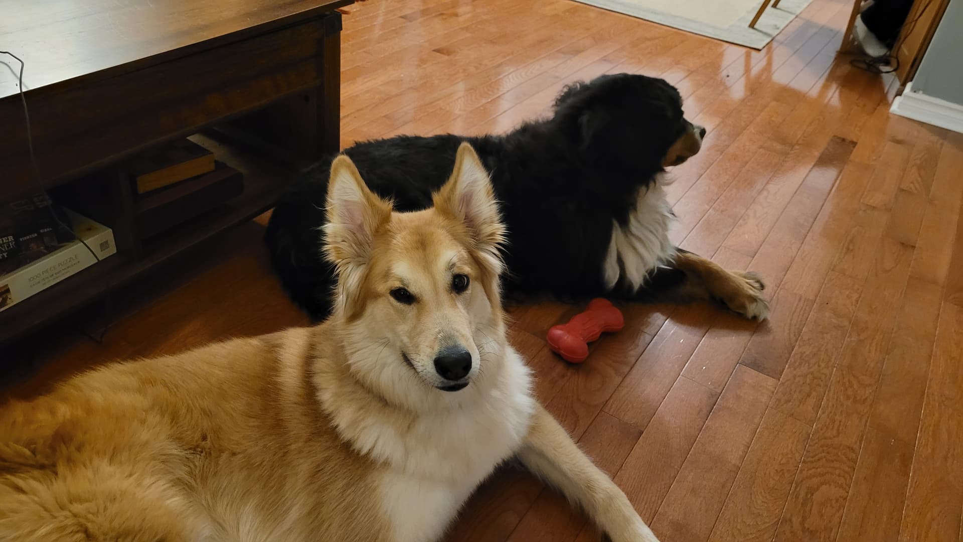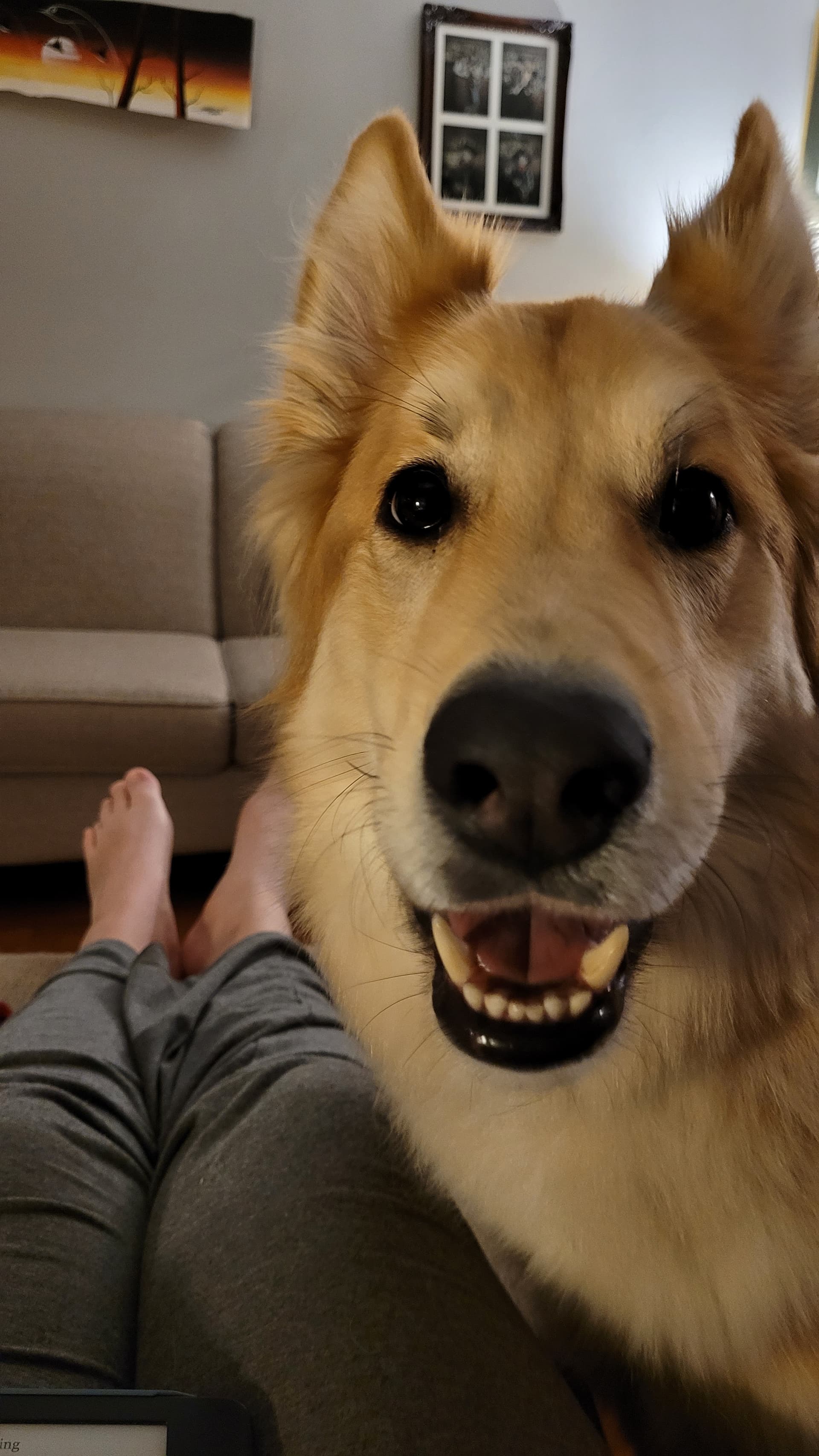 His mom was rescued from Northern Ontario, pregnant with 9 puppies including Ares. The foster home did a DNA test on her, and it came back 25% each lab, husky, Shepard, and 12.5% collie, 12.5% ‘other terrier breeds’.