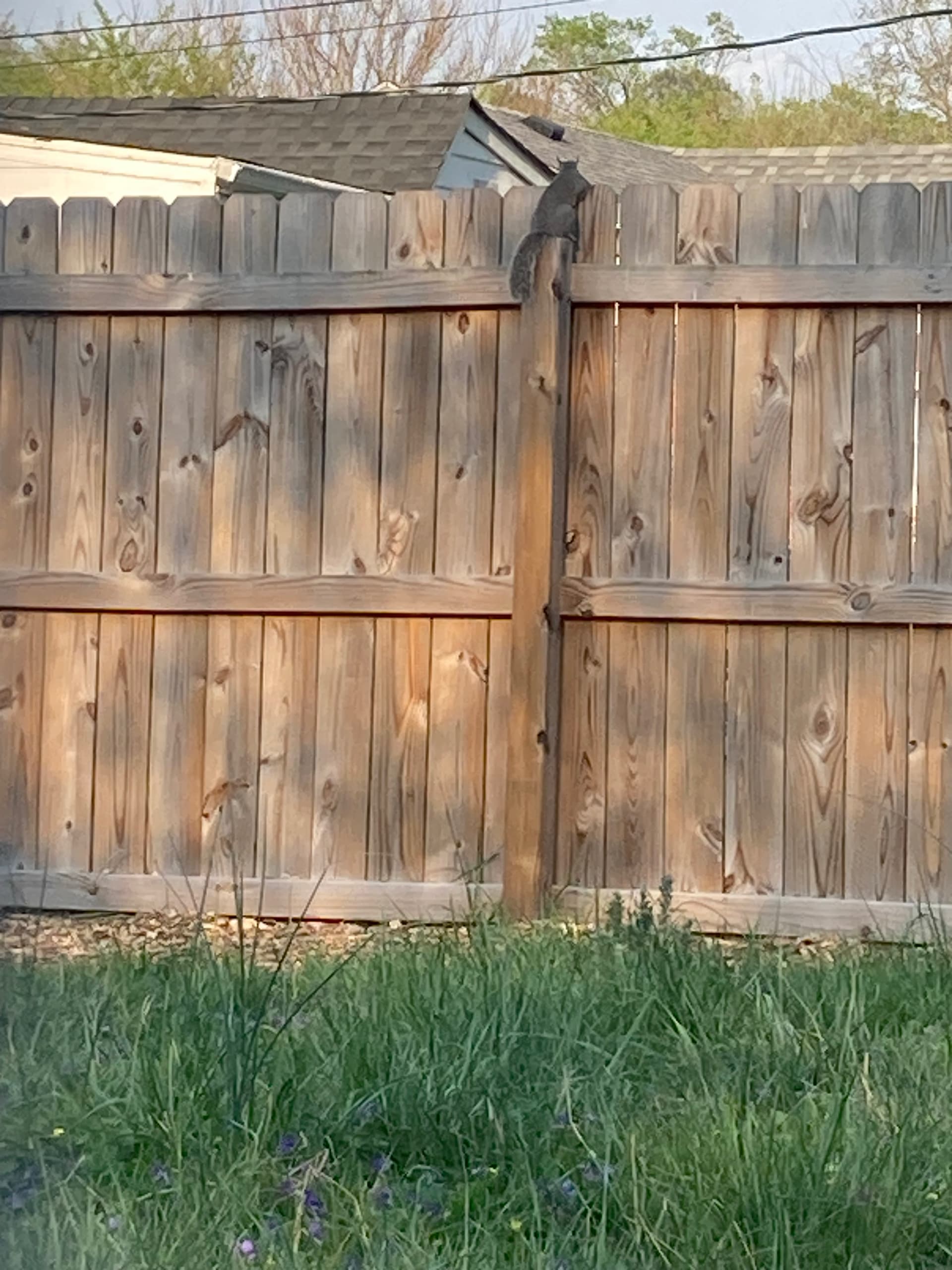 Are these the neighbors that used to watch you before you had the fence? Because if they are, that squirrel’s got your back.