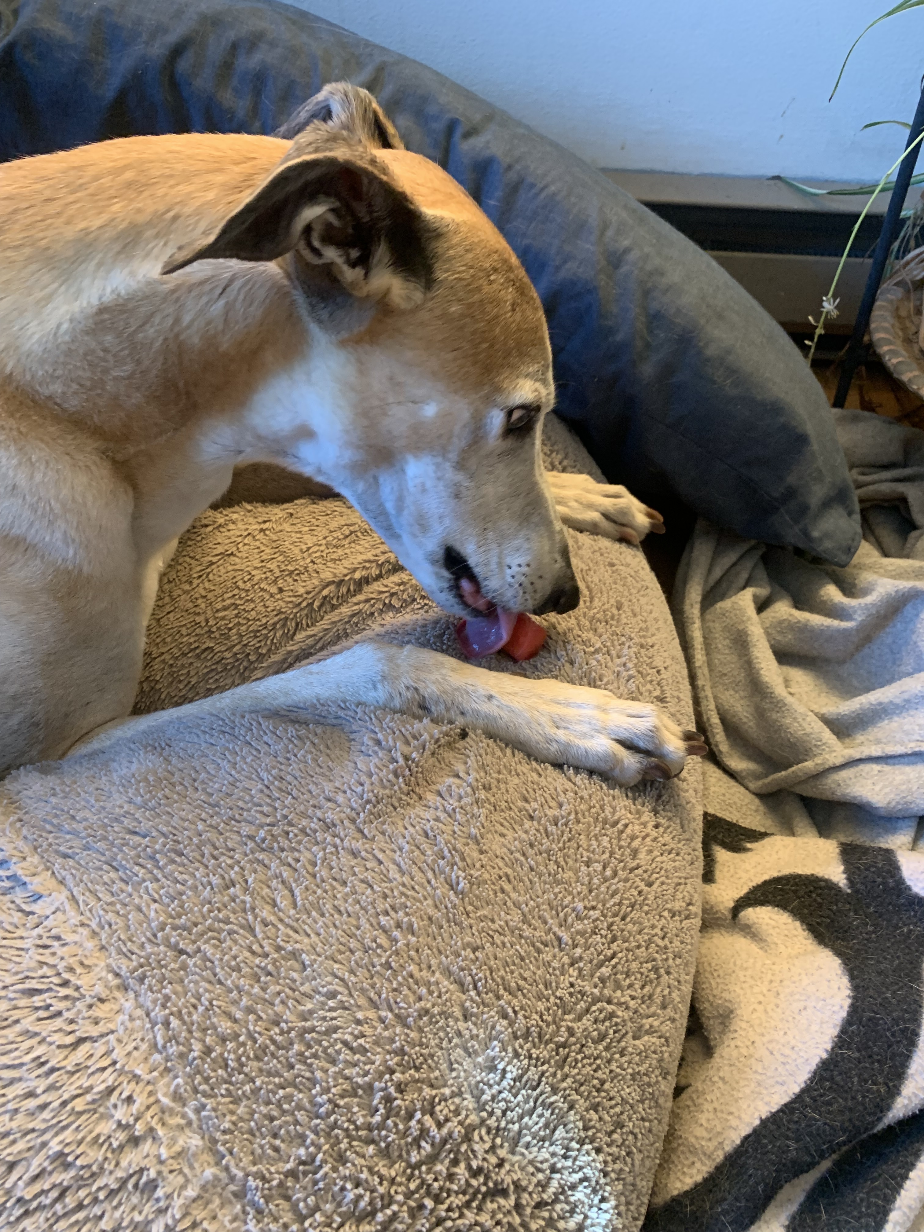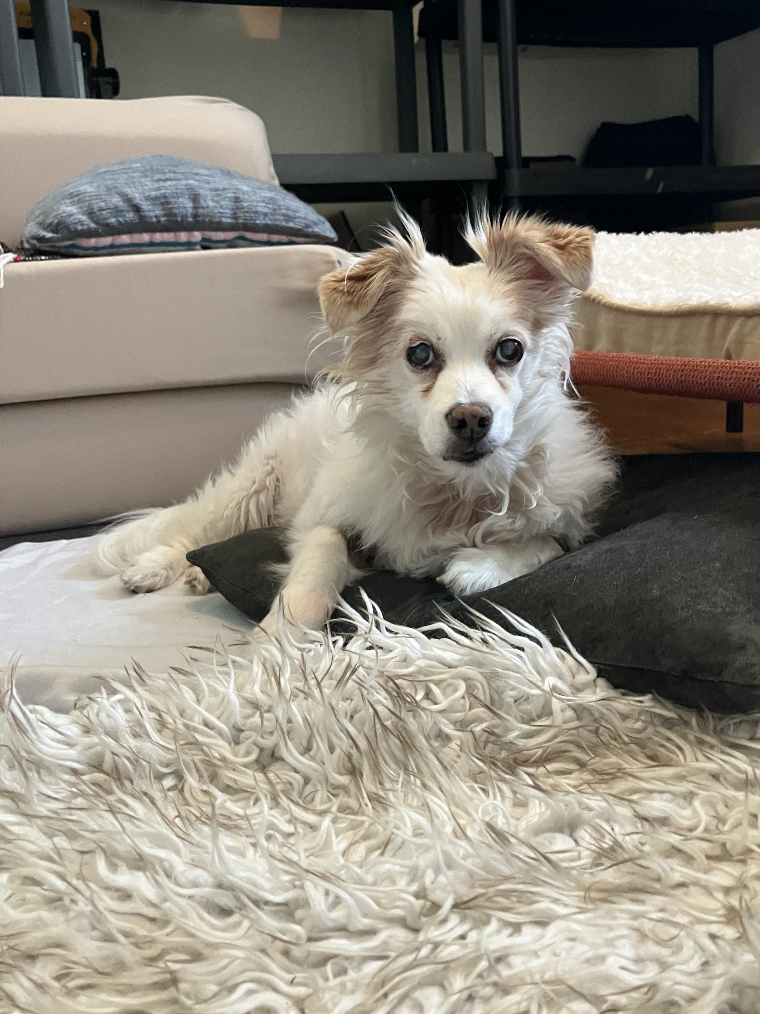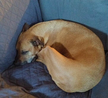 Sad friend after I got up from my seat and apparently forced him to curl the other direction (this couch is huge, he’s close to 100lbs)