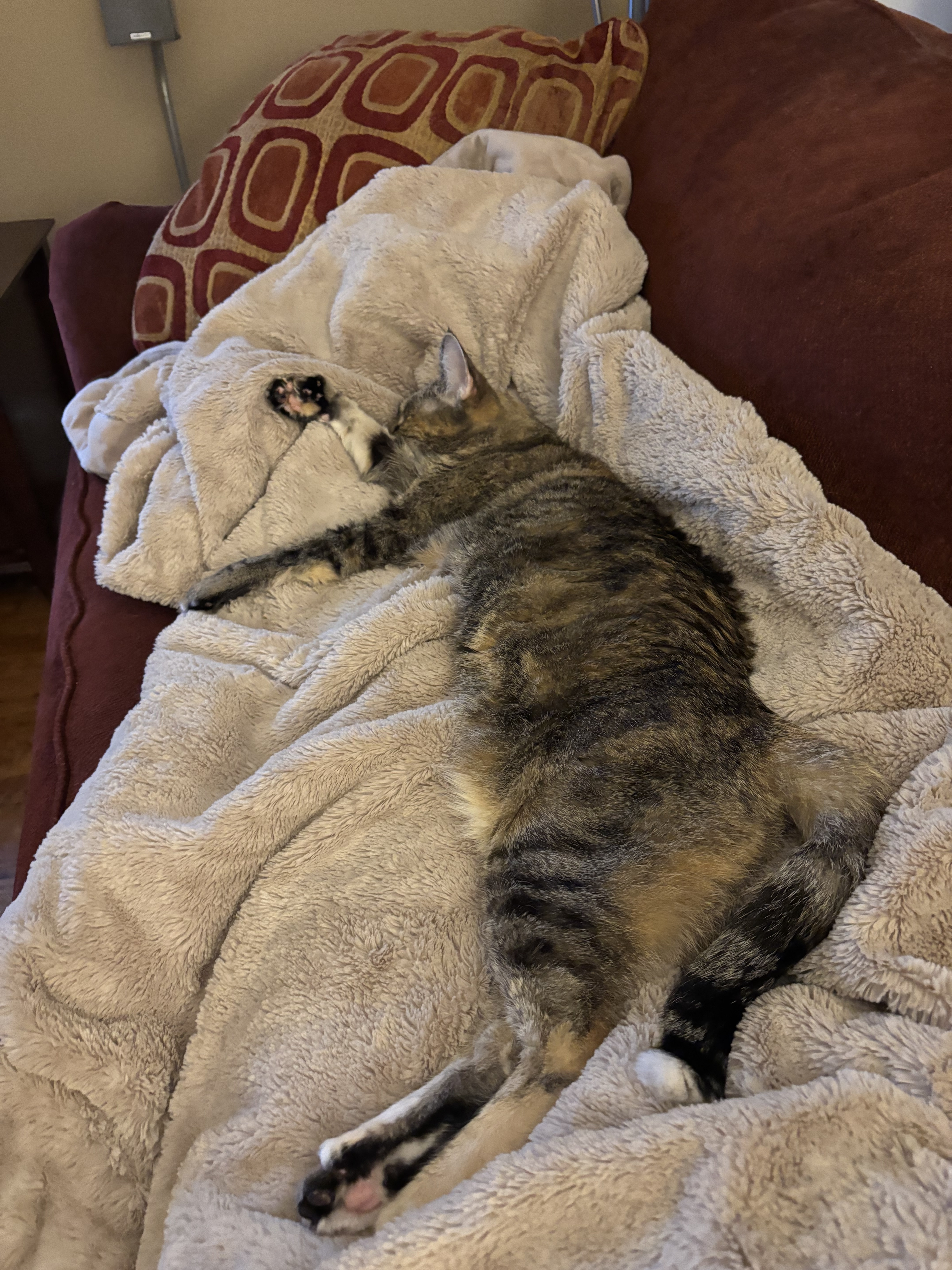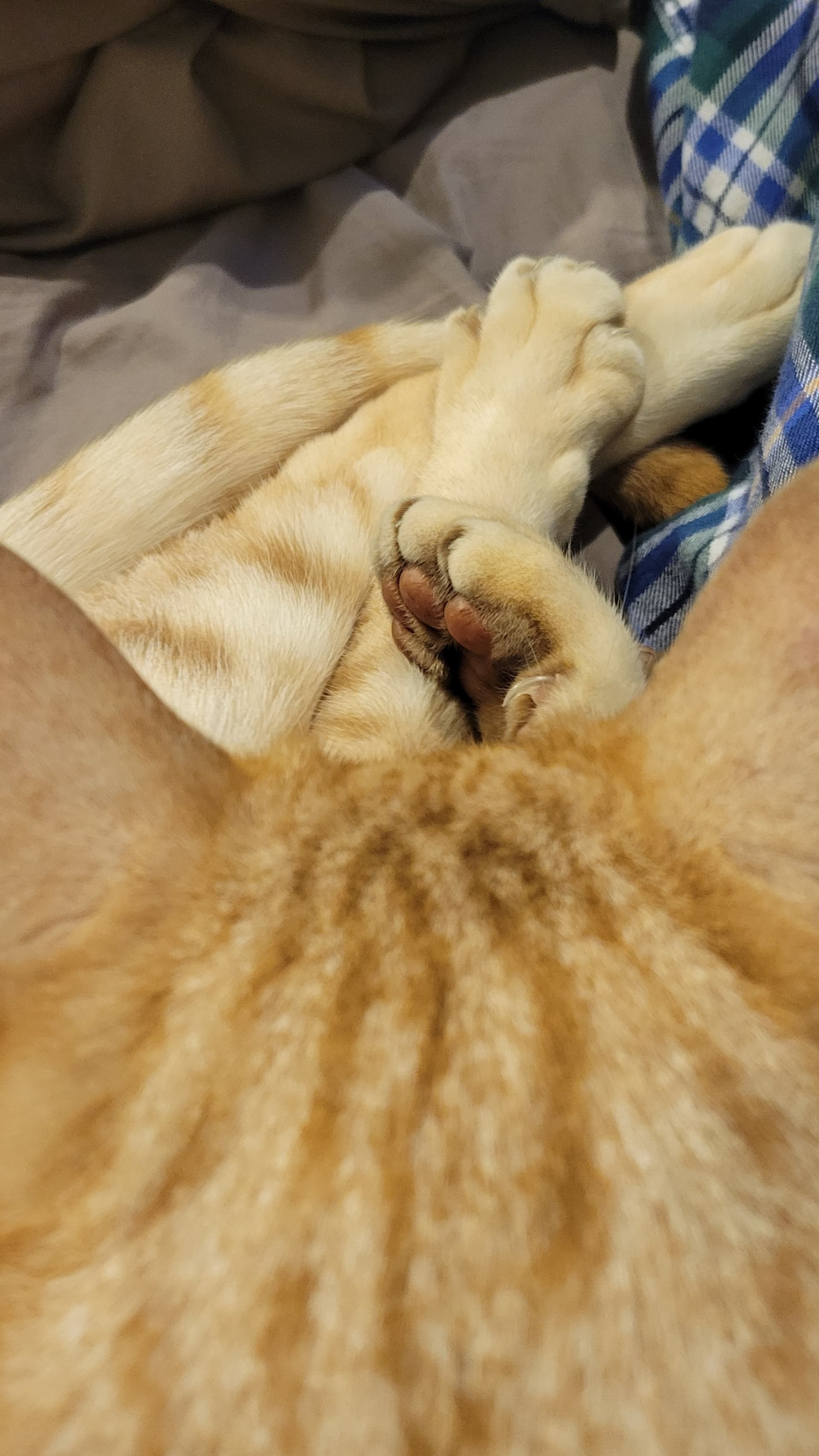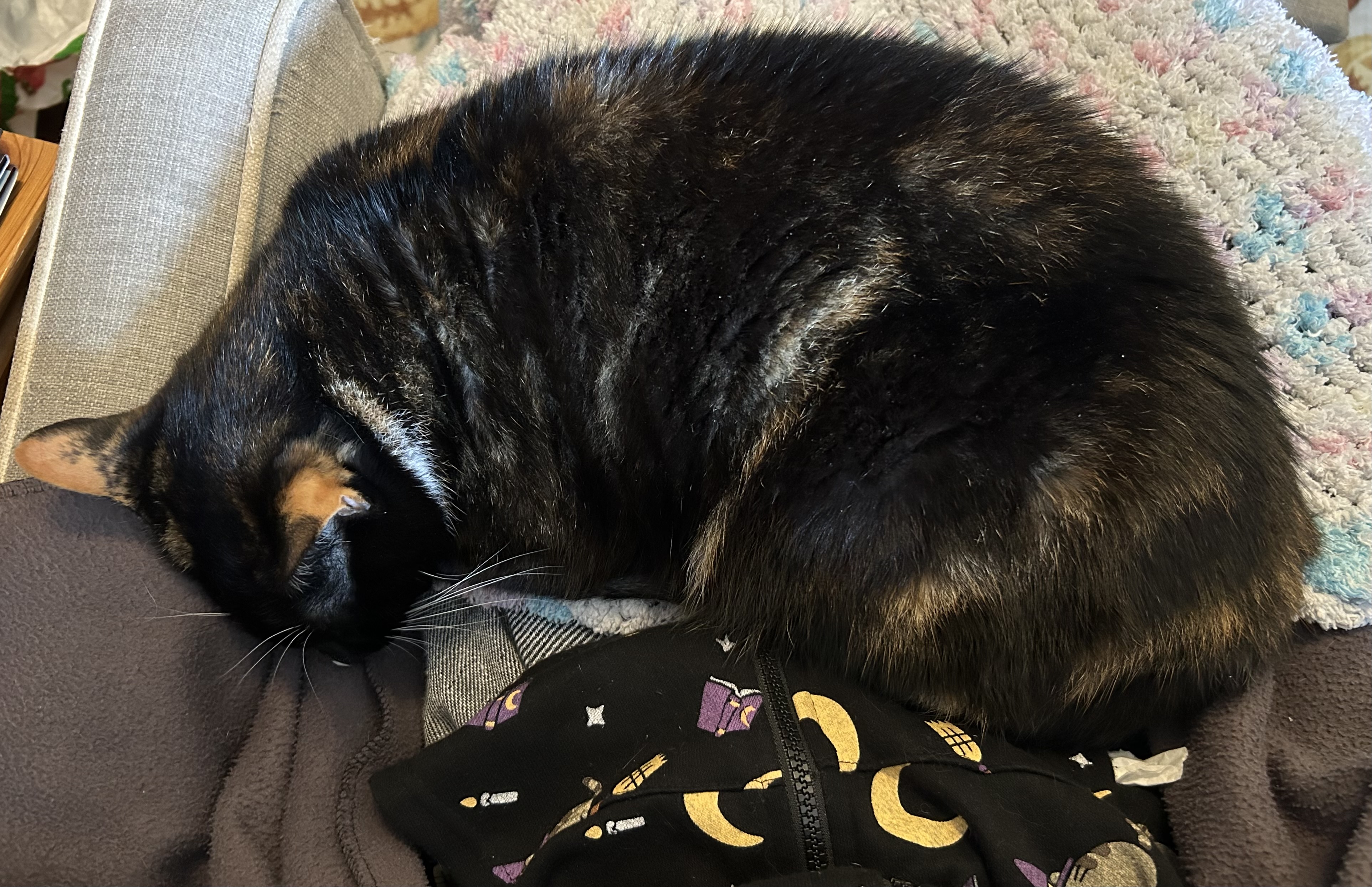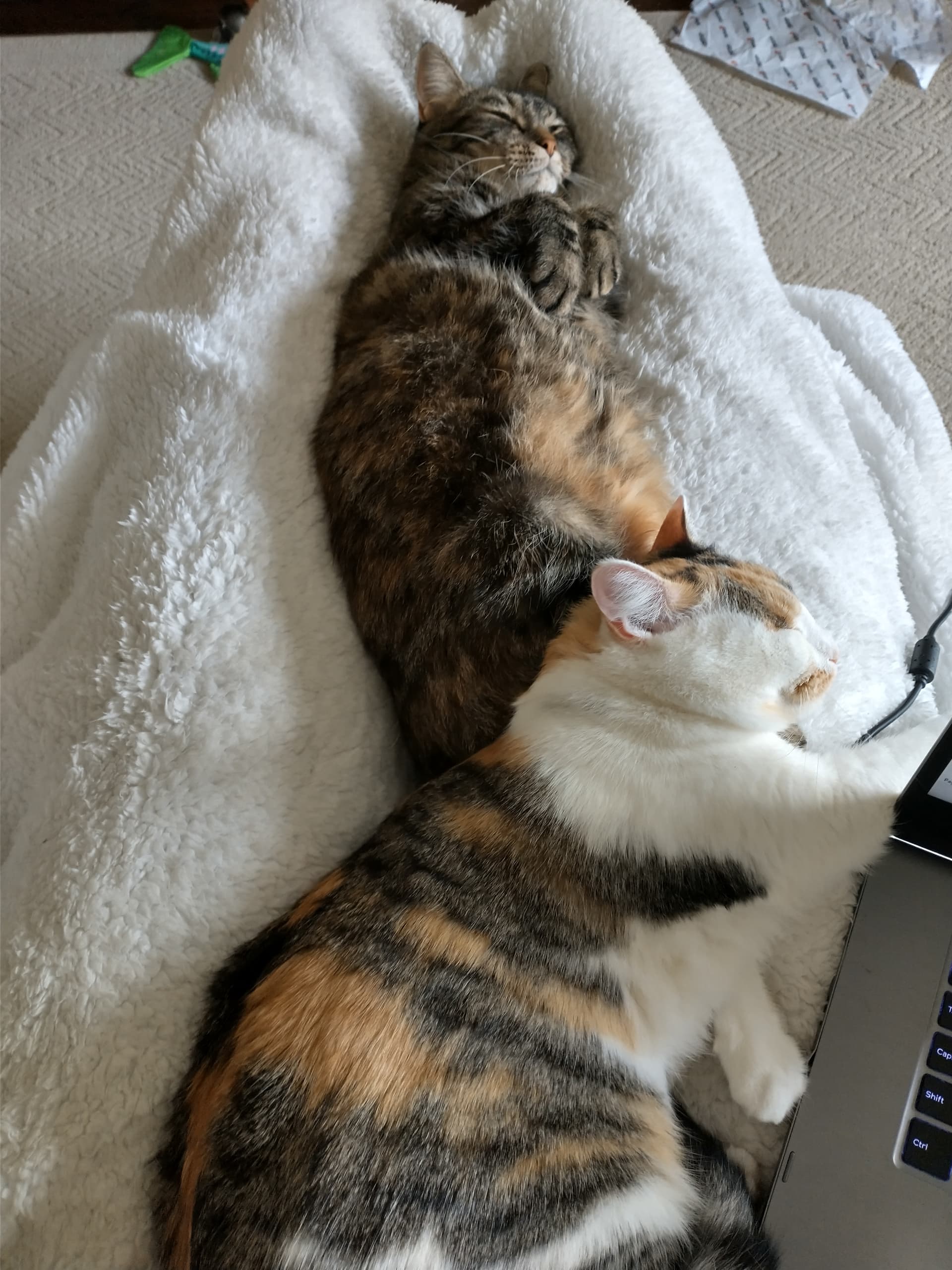 Yesterday was 6 months since my kittens moved in. I went from foster to adopter after month 1. They are sweet, bonkers, curious, and cozy in turns. Here’s cozy: