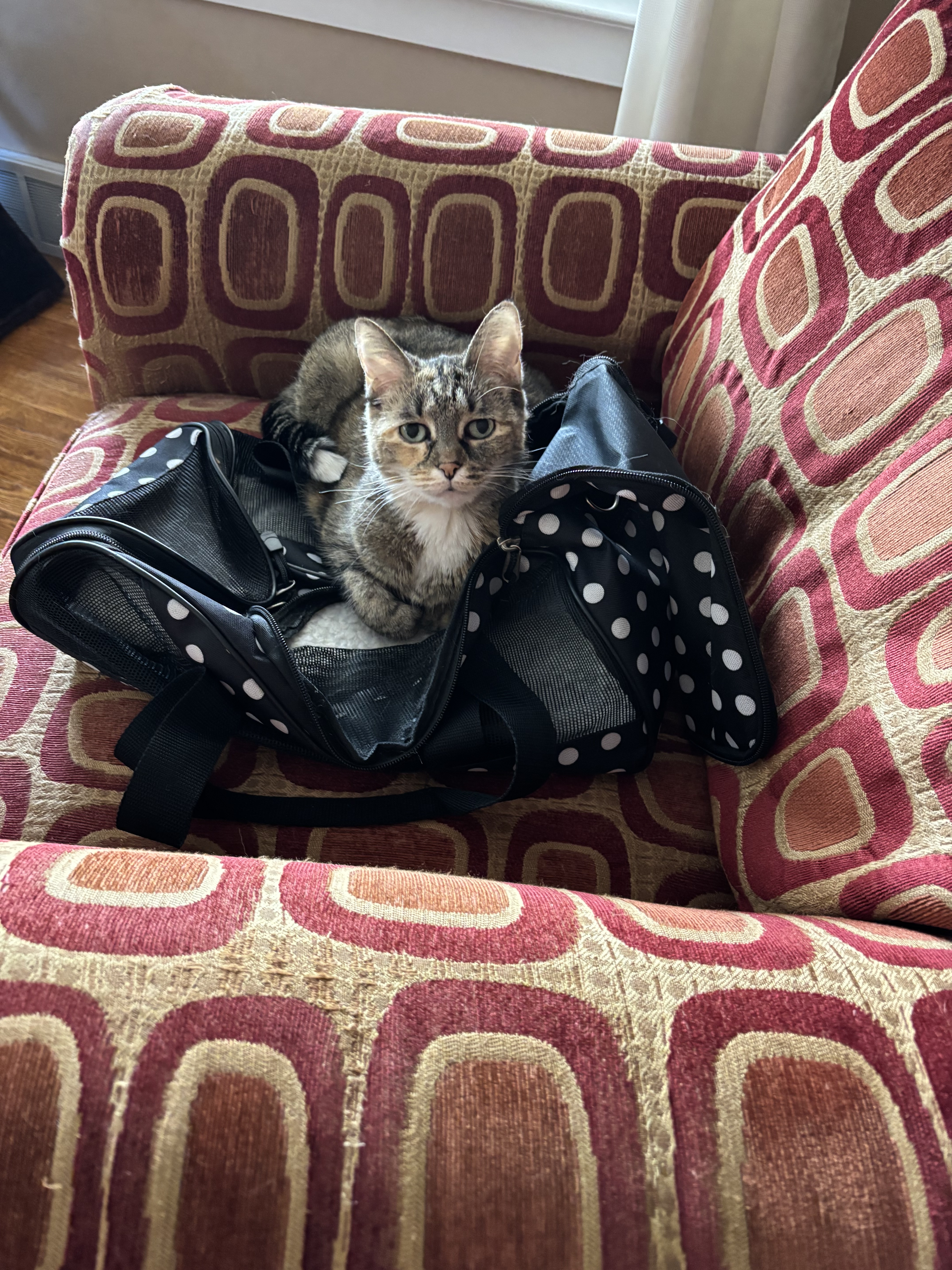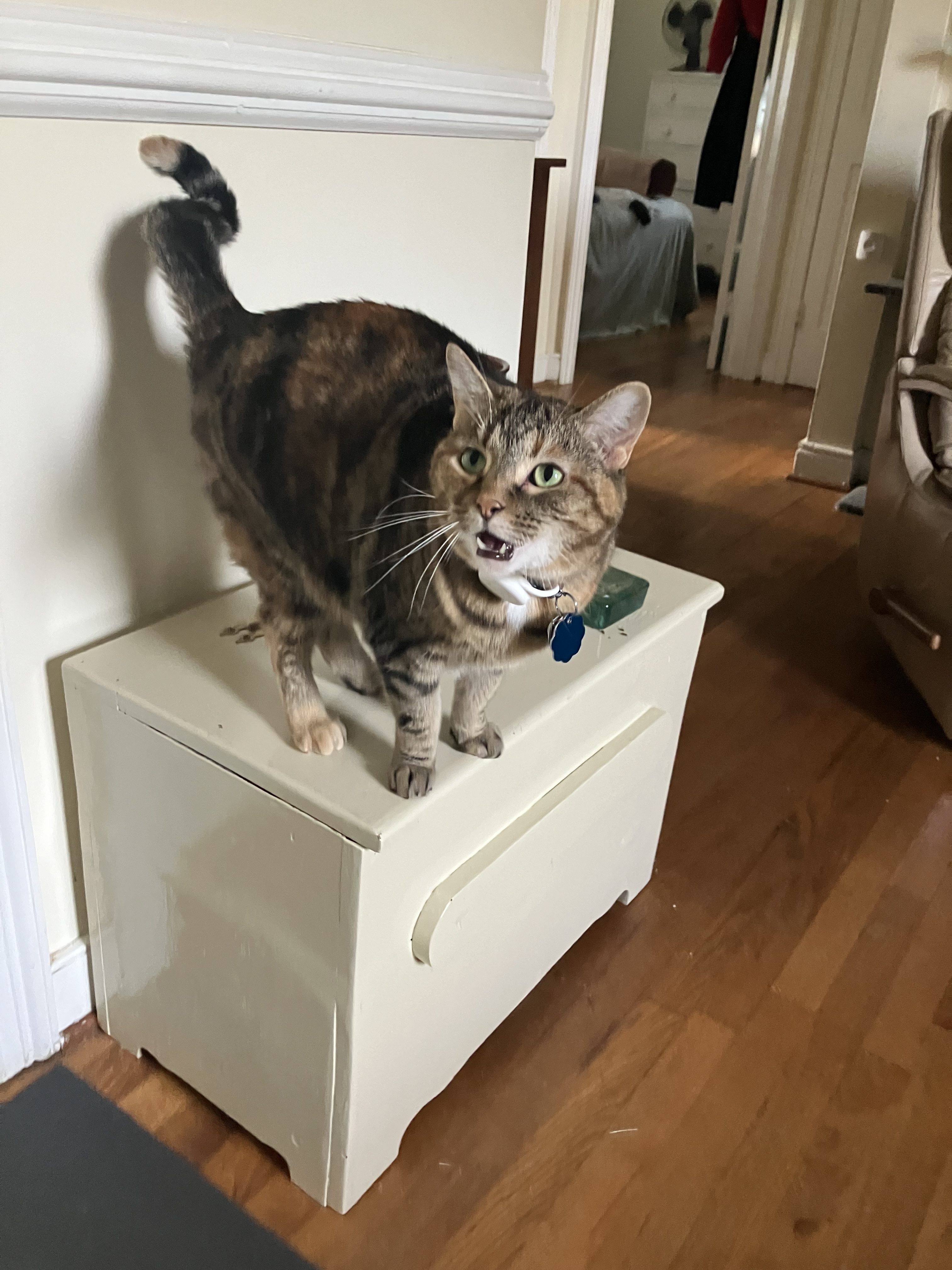 She loves her carrier until I have to shove her into it, then she yells until she gets out of it again. Today was 50 minutes. She got a good report from the vet, including that her teeth look good because she saw them while she was being hissed at.