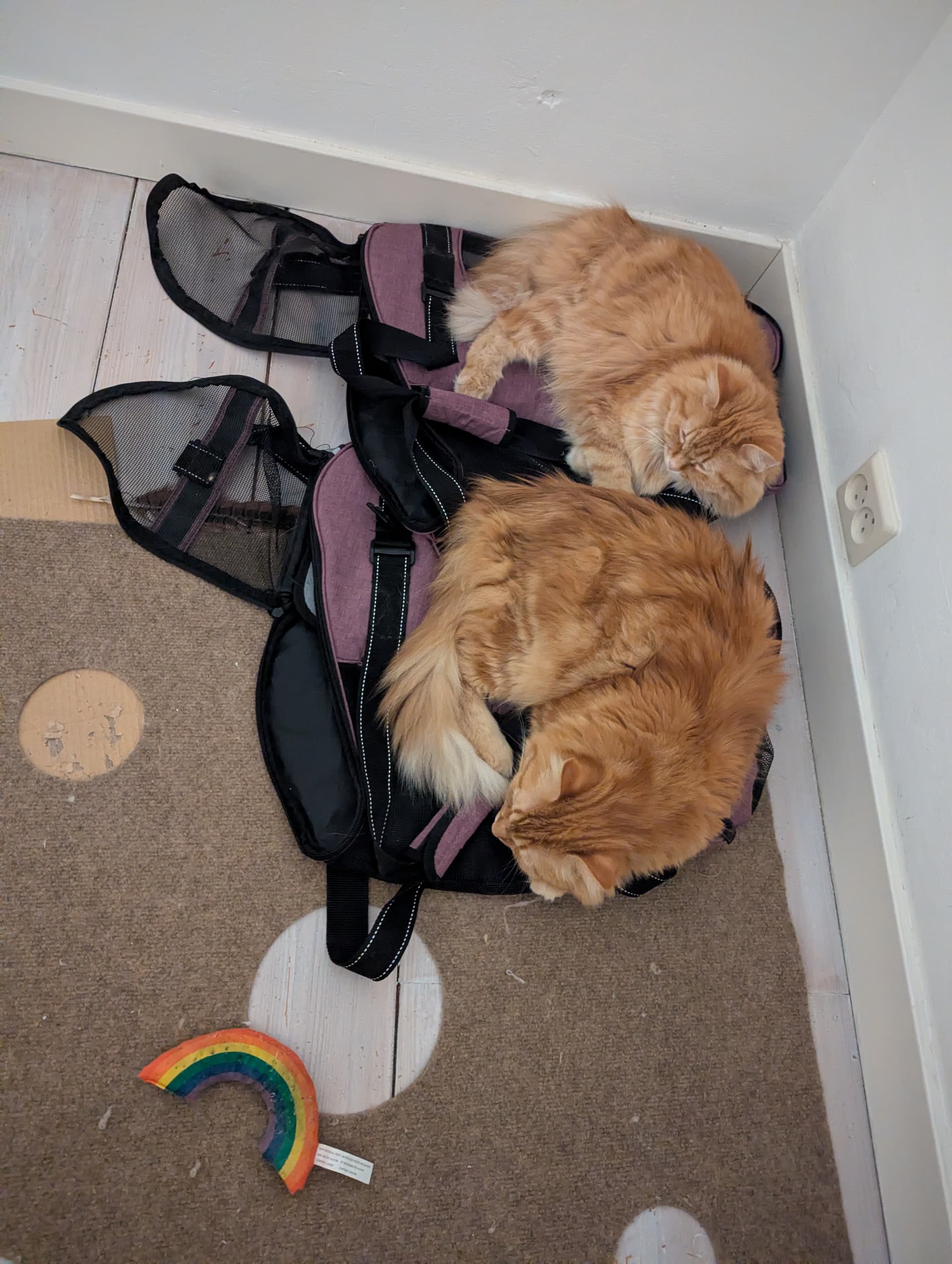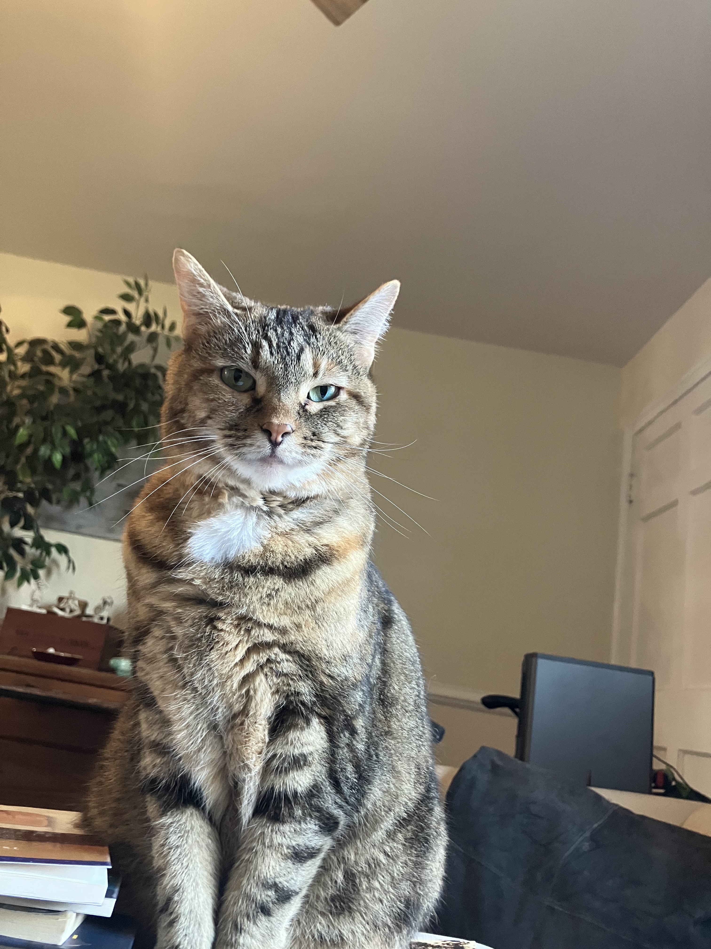 What I notice is the placement of scratching posts in front of the couch arm. I, too, have this arrangement. We all know WHY. (I actually need more scratching posts.)