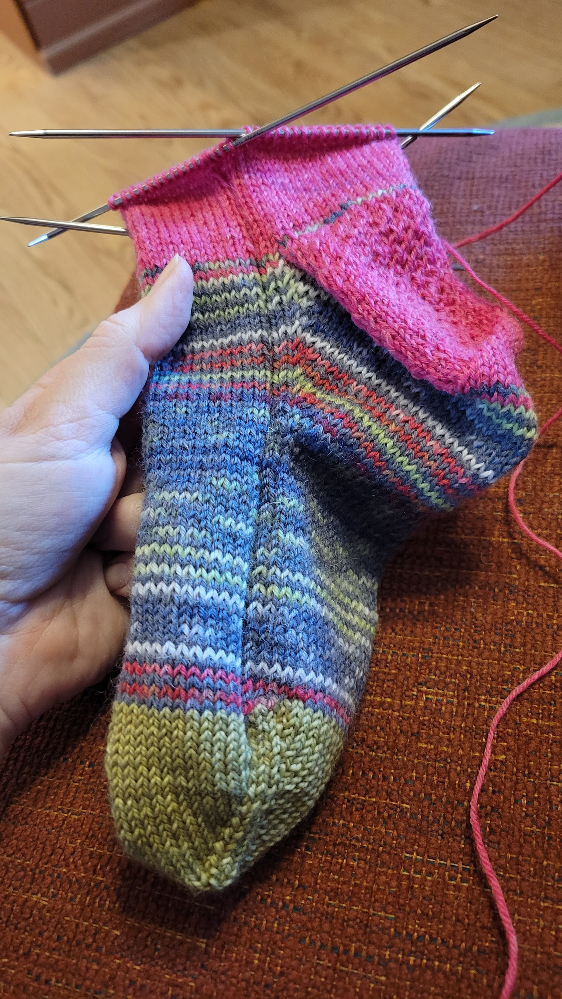 this grey & pink yarn was a freebie. It’s a good German sock yarn, but it does not play easily with other colours of yarn I have