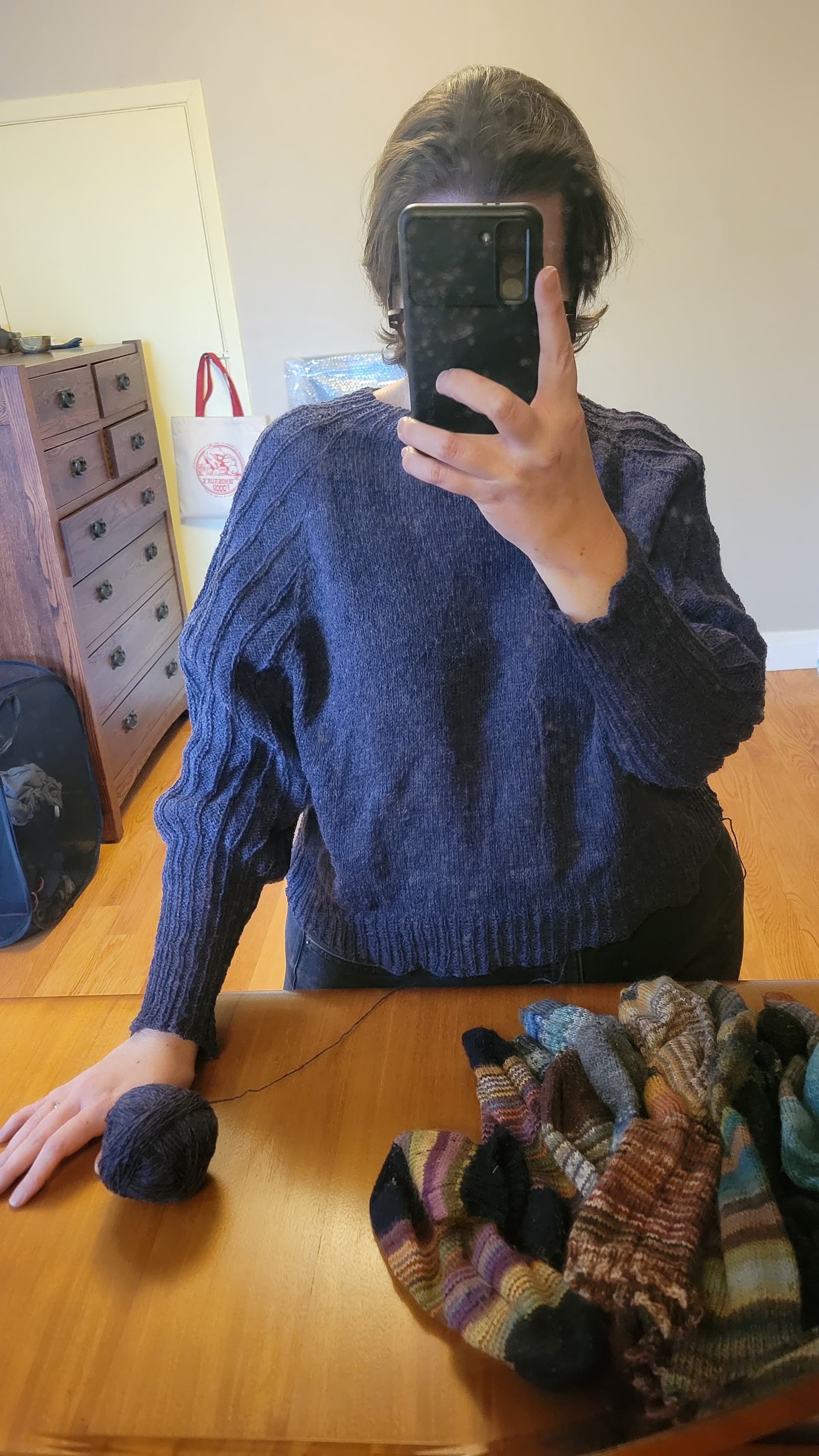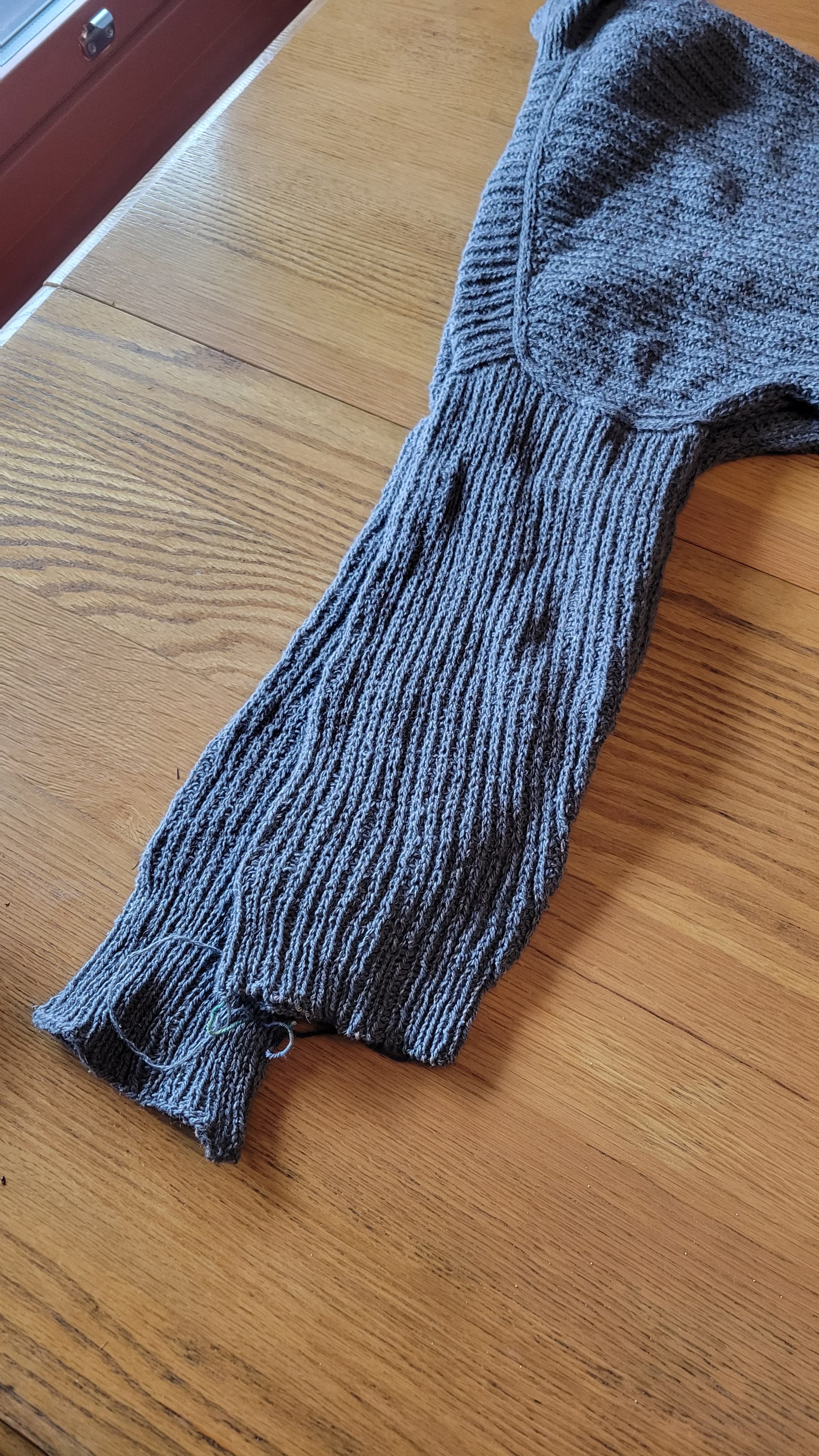 it appears that I had completely lost at yarn chicken, and the two balls of grey yarn that were with this sweater aren’t actually the same yarn as I knit the sweater with. So I need to rip back half of the difference on the longer sleeve and bind off both again.