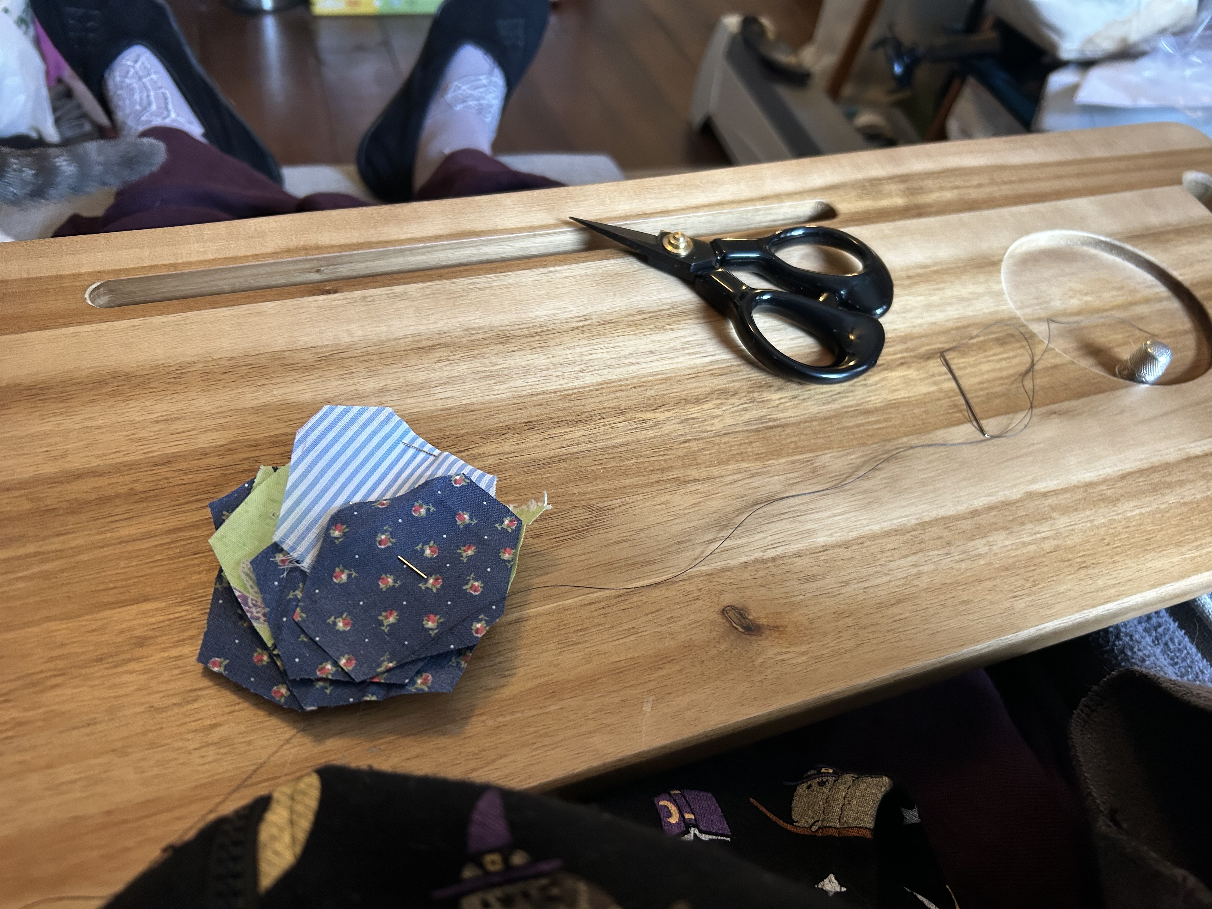 This thread has been quiet for a while but I am pleased with my setup for some English paper piecing in my recliner.