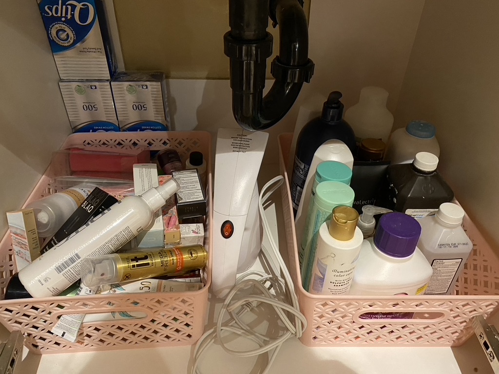 Under the sink. These baskets pull out like drawers, each one is divided into two compartments. I have stuff in categories but mostly it’s just extras. I have so much makeup and skincare stuff. Thee little basket in the middle is hair tools which I very rarely use so I’m not getting into it much.