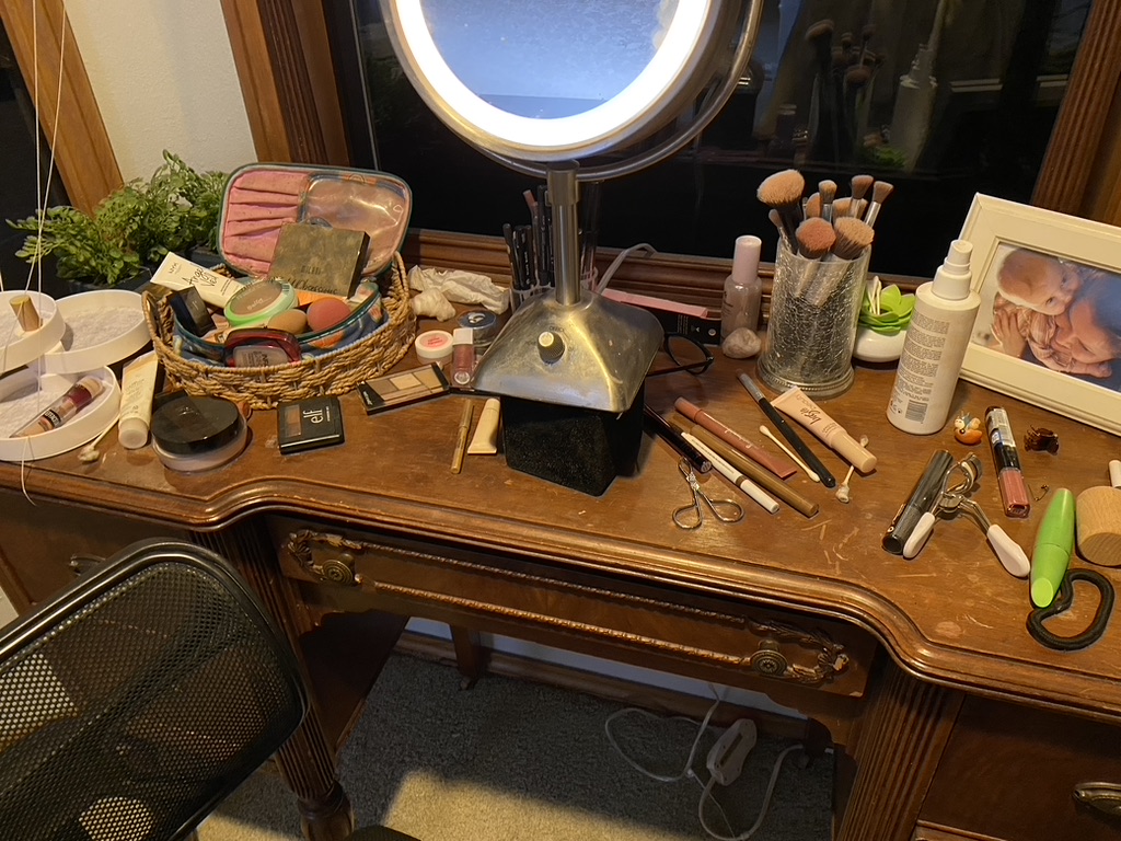 Now here’s what I actually use every day. It’s a big ol’ mess and I considered cleaning it up for the photo but you get the real deal. I do need to clean it up, though.