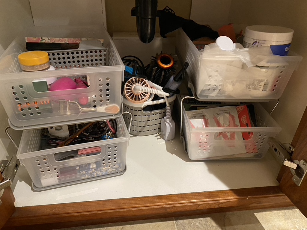I can’t sleep so I just reorganized my bathroom and it looks just ok IMO. Show me how you store your skincare and makeup and related items? I had a big counter thing but I got rid of it because it was too ugly. Now I have stuff in trays under the sinks but, IDK, there is probably a better way? TY!