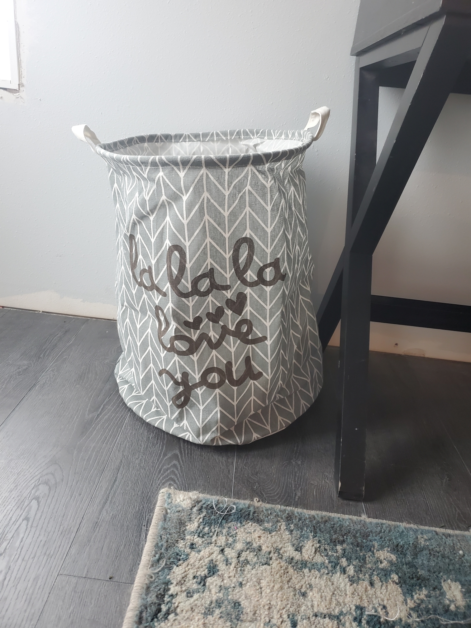 We now have a 2 story house with the laundry and all bedrooms upstairs. This meant the toddler would sometimes decide to change clothes downstairs or we have kitchen laundry downstairs. Instead of fighting it we now have a cute laundry basket in the living room thanks to a Menards rebate!
