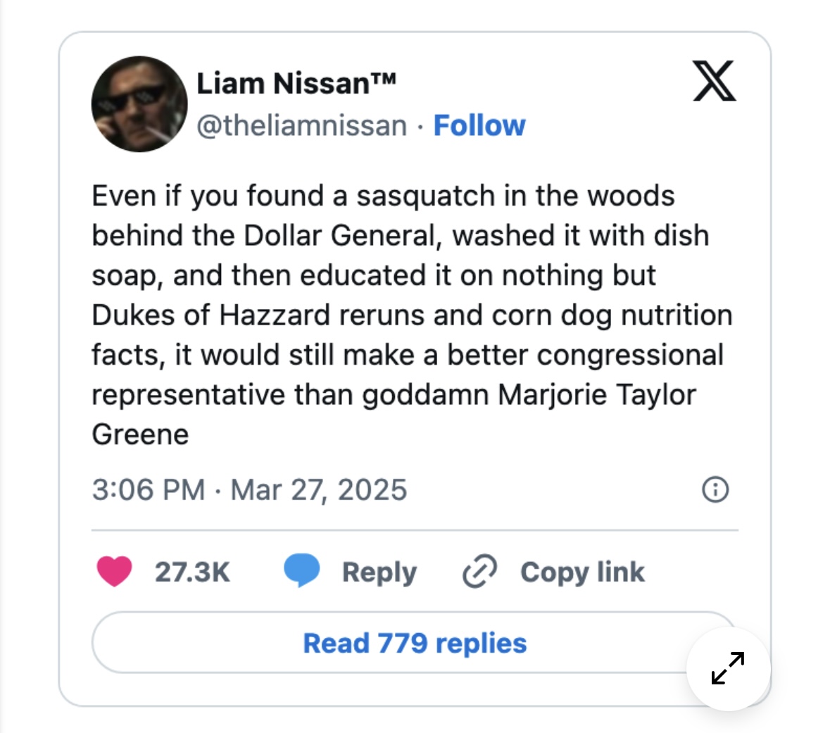 Trump is backing Marjorie Taylor Green against incumbent Democrat Jon Ossoff, who, unlike her, has a brain. Just sent his 2026 campaign a donation.
