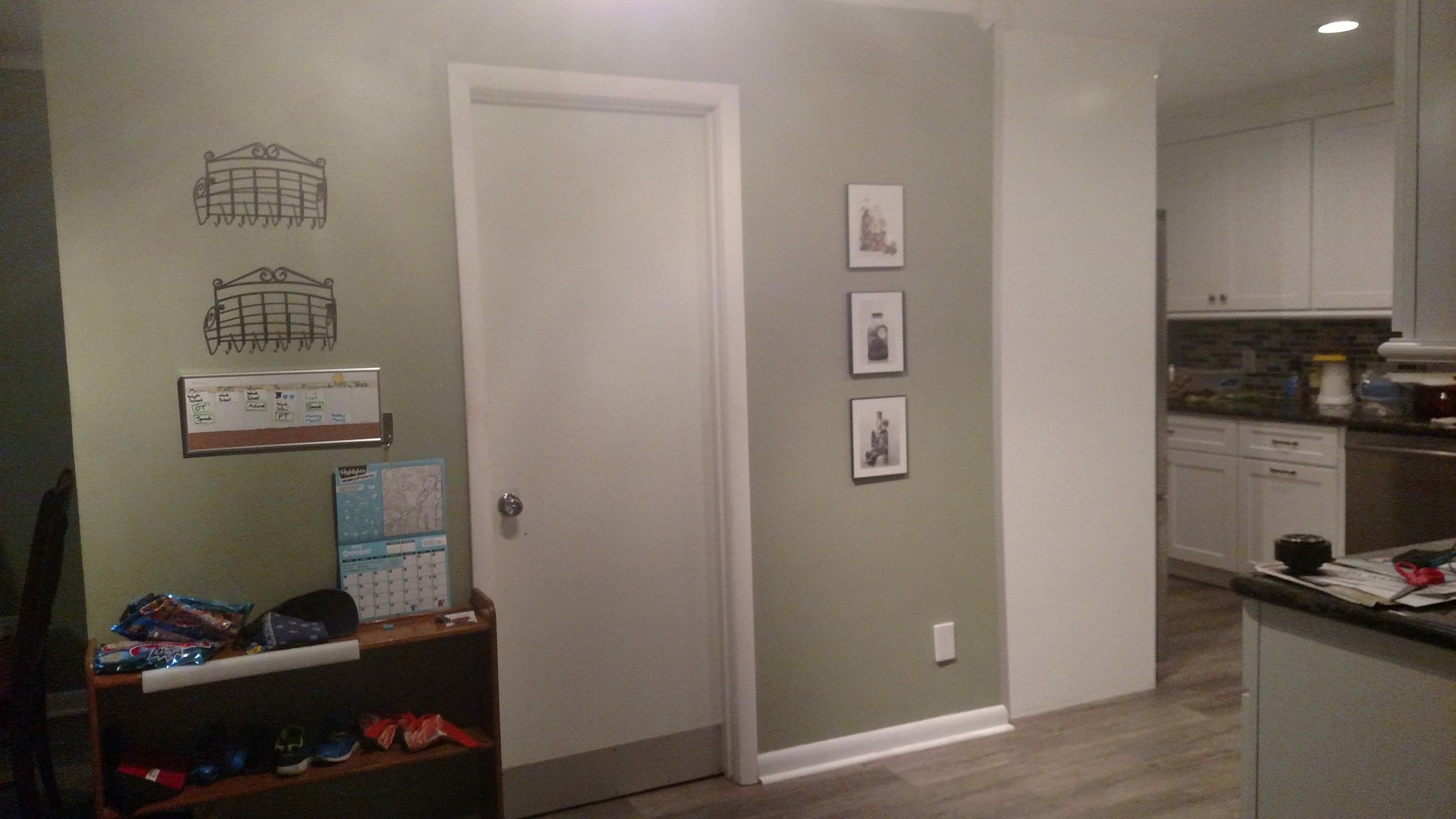 It was Kiddo’s turn to choose for movie night and his “movie” was some 45 minute cartoon thing he insisted on even though we told him he could re-choose. This means even though I’ve been dragging all day, I had just enough energy after bedtime to measure and mark walls to hang up art (yay!) and a small whiteboard (meh) and this year’s cinnamon broom (mmm!)