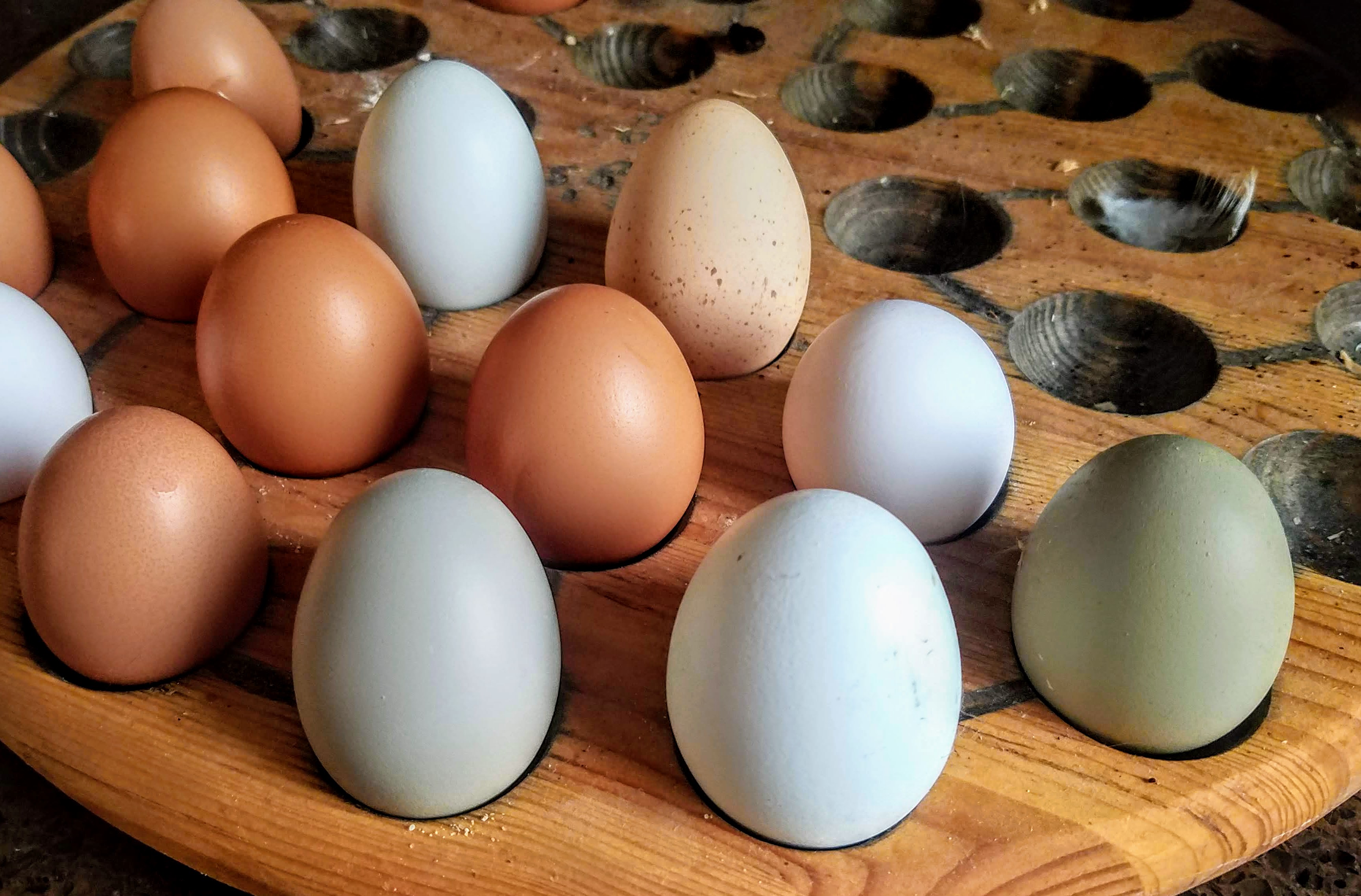 Unfortunately none of our new chickens are laying AMAZING eggs, lol. This is our current color spectrum. We do have a nice range, from white through dark brown. I’m mostly disappointed in the blues - the eggs in the front are an olive egger, our new ameraucana, and another olive egger.