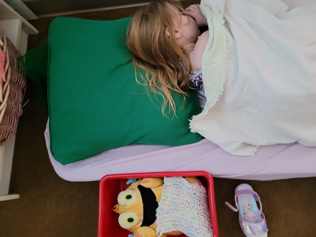 My 3 year old LOVES this monster stuffed toy at daycare, and her teachers let her play with it pretty exclusively. Look at this tiny bed they have it “sleep” in during nap time <3
