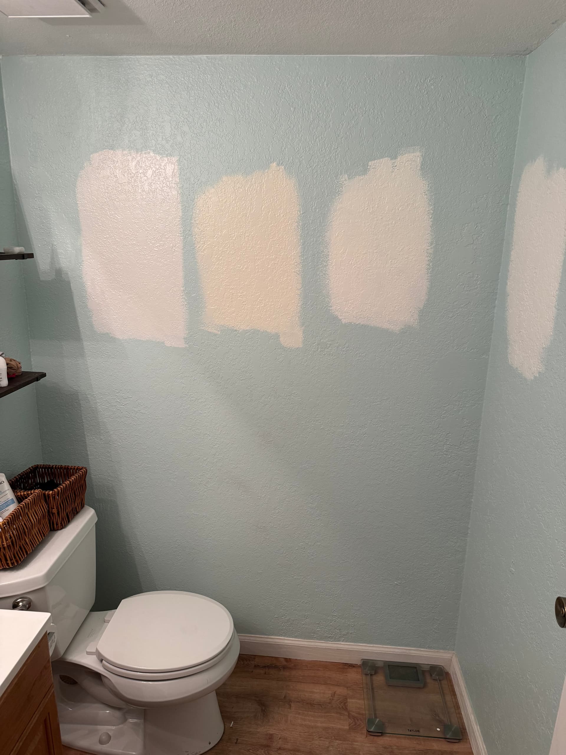 PS you could try changing the light bulbs before you redo the paint. Warmer light could give more of the grey-green you were going for? And it’s more cozy in a bathroom anyway