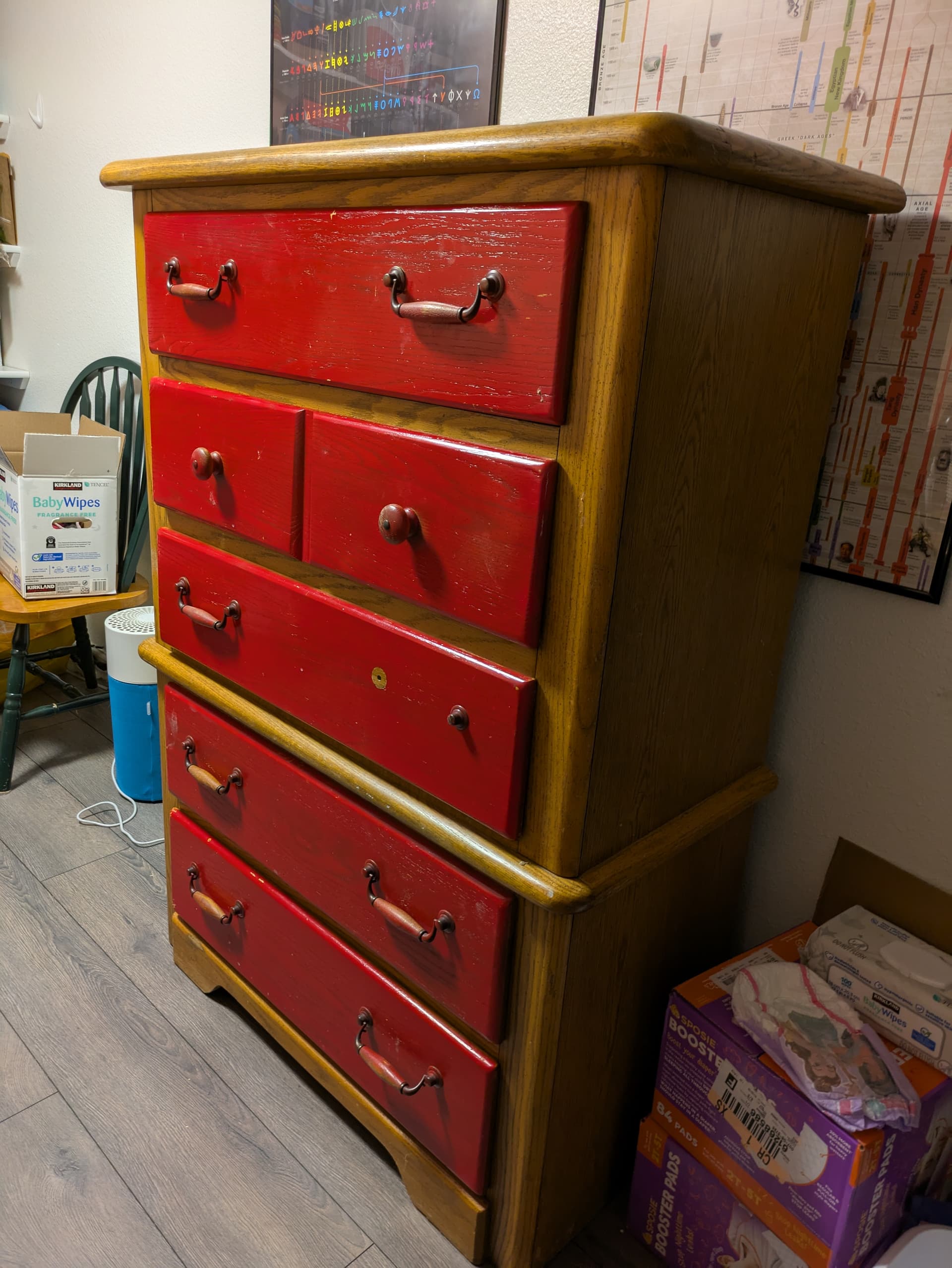 I need help! I got this great old Stanley dresser free from Buy Nothing. My thought was to paint it white and maybe pink for the drawers to cover up the red- it is for a little girl’s room.