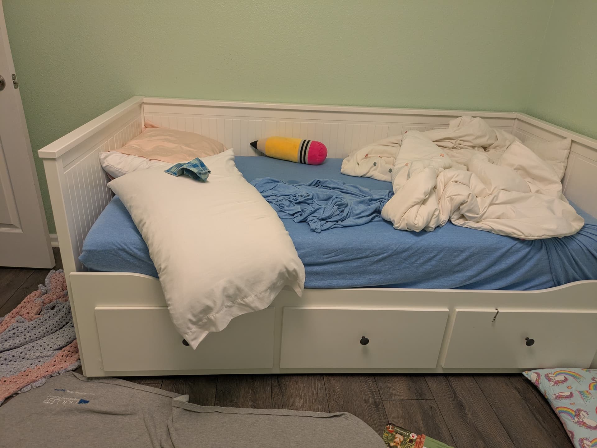 Please ignore mess. This is the Hemnes daybed I have. The storage drawers are big enough for household linens and it pulls out into short of a short king bed.